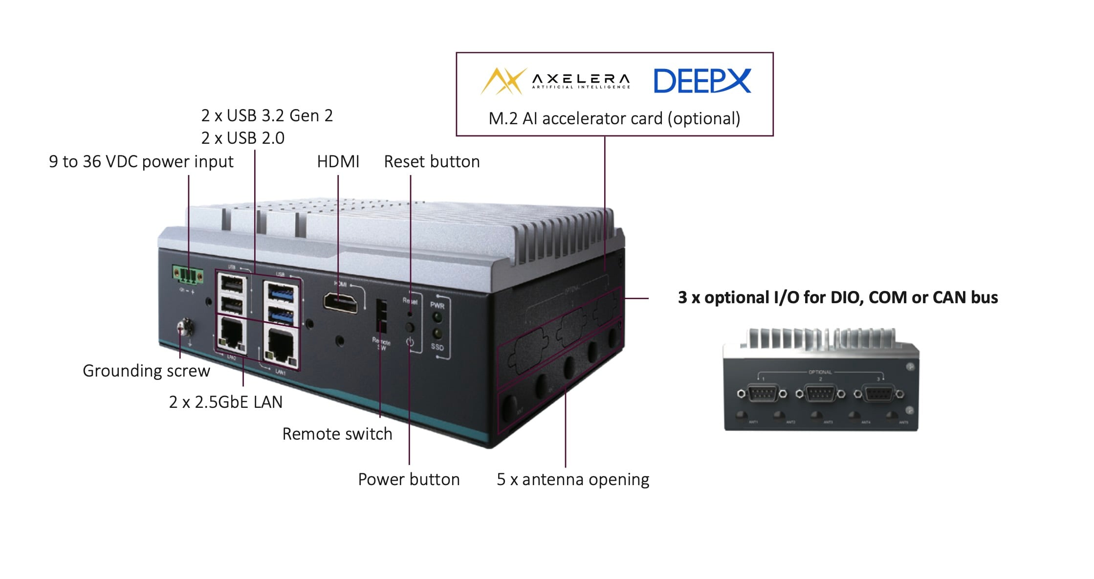 Le mini PC industriel est équipé de 8 ou 16 Go de SDRAM LPDDR5, et les besoins en stockage sont pris en charge par un emplacement M.2 2280 de 2,5 pouces, ainsi que par un emplacement mSATA. Un emplacement M.2 2230 est également présent pour accueillir les cartes réseau sans fil. Le refroidi passivement le système à refroidissement passif est construit en aluminium et en acier, ce qui donne au mini-PC un aspect très industriel, qui convient aux environnements auxquels il est destiné. De plus, un emplacement nano SIM est également prévu. Les E/S proposées sont les suivantes :
