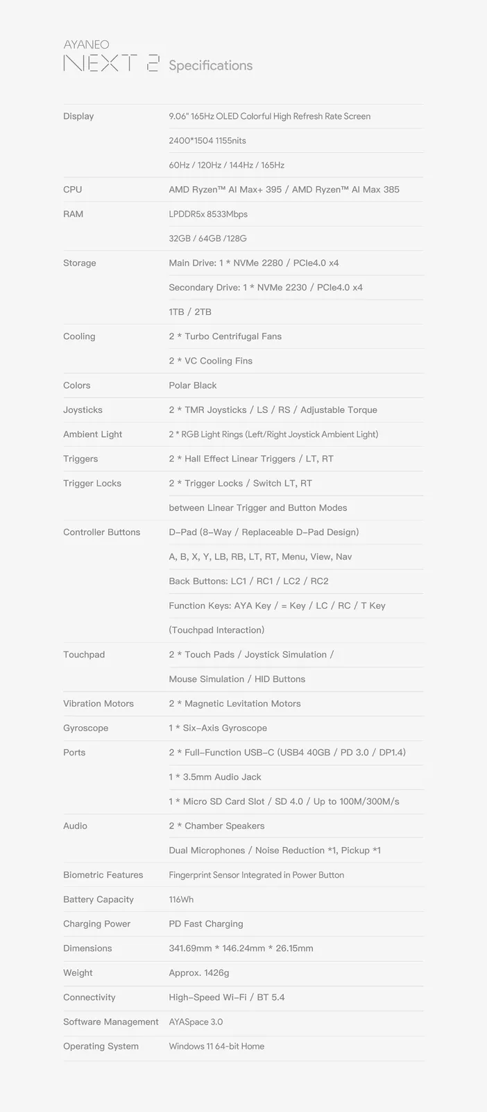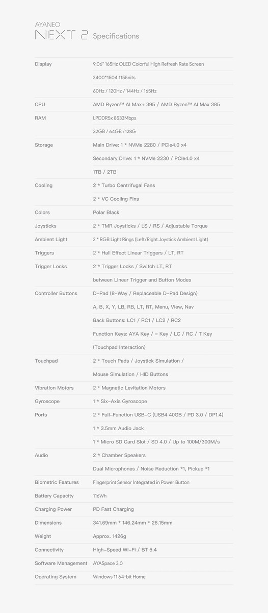 Plus précisément, Ayaneo propose le Next 2 avec l'un des deux APU suivants Ryzen AI Max 385 ou Ryzen AI Max+ 395tout comme le OneXPlayer Apex et GPD Win 5 avant lui (actuellement 2 399,99 $ sur Amazon). Le Next 2 se distingue de ses pairs par un écran OLED de 9,06 pouces et une batterie externe de 116 Wh. Au total, le Next 2 pèse 341,69 x 146,24 x 26,15 mm et environ 1,43 kg. Veuillez consulter la fiche technique ci-dessous pour obtenir tous les détails techniques.