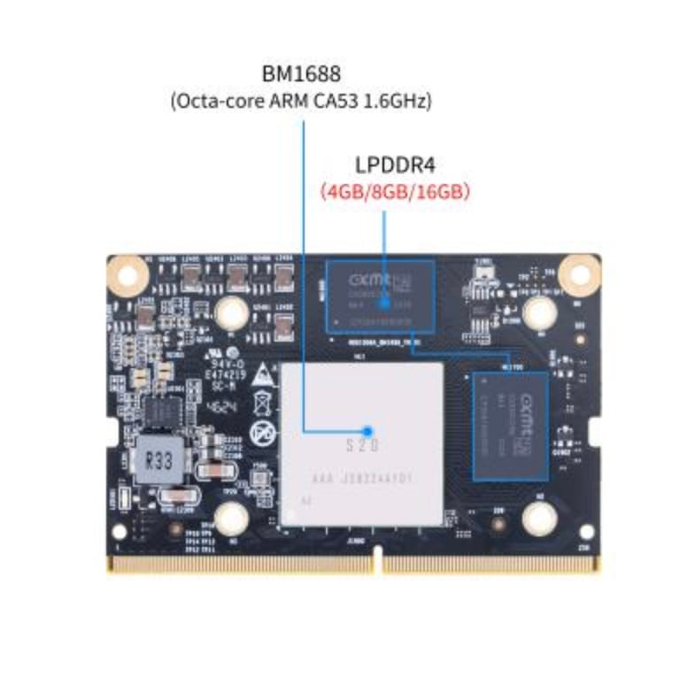 Pour être plus précis, le BM1688 embarque un processeur à 8 cœurs composé de Cortex-A53 cadencés à 1,6 GHz, associé à 8 Go de mémoire LPDDR4x. Le NPU intégré peut atteindre 16 TOPS en précision INT8 et 4 TFLOPS en FP16. La puce est capable de décoder et d'encoder respectivement 16 canaux et 10 canaux de vidéo HD (1080p30).