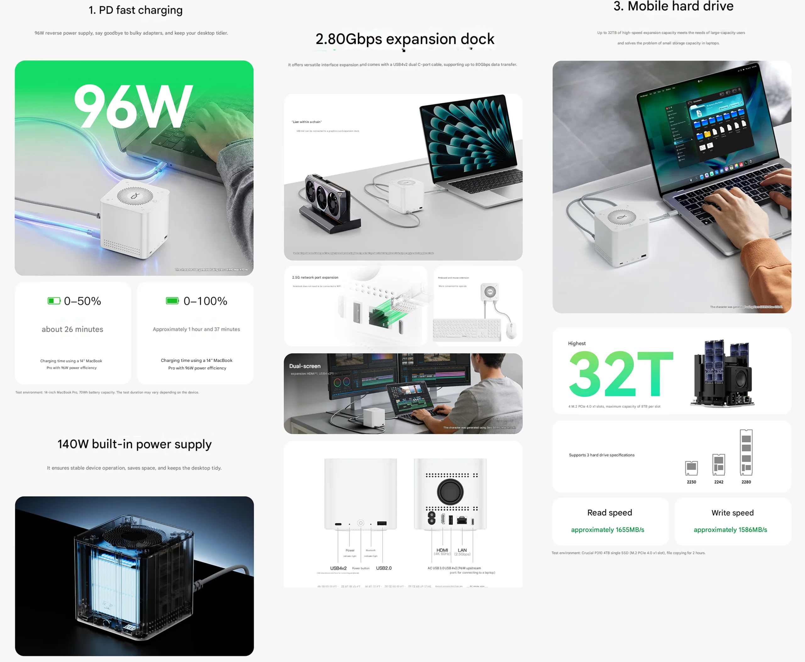 Un autre point fort de la station d'accueil est la présence de quatre emplacements M.2, qui peuvent accueillir un total de 32 To de stockage. Beelink précise qu'il s'agit d'emplacements PCIe 4.0 x1 et affirme que la station d'accueil peut offrir une vitesse de lecture de 1 655 Mo/s et une vitesse d'écriture de 1 586 Mo/s.
