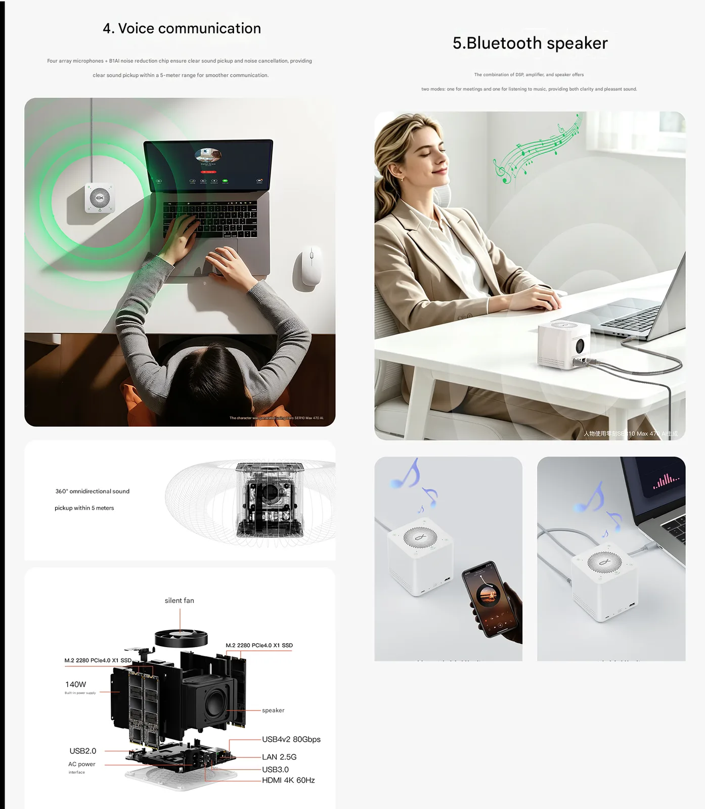 La station d'accueil dispose également d'une connectivité Bluetooth pour le haut-parleur intégré. Beelink indique qu'il y a un DSP intégré et un un amplificateur pour garantir une bonne qualité audio pendant les réunions et la lecture de musique. Il est également possible d'écouter de l'audio en mode câblé, mais dans ce cas, le son passe par le PC connecté. La station d'accueil est même équipée d'un ventilateur pour refroidir les composants internes.