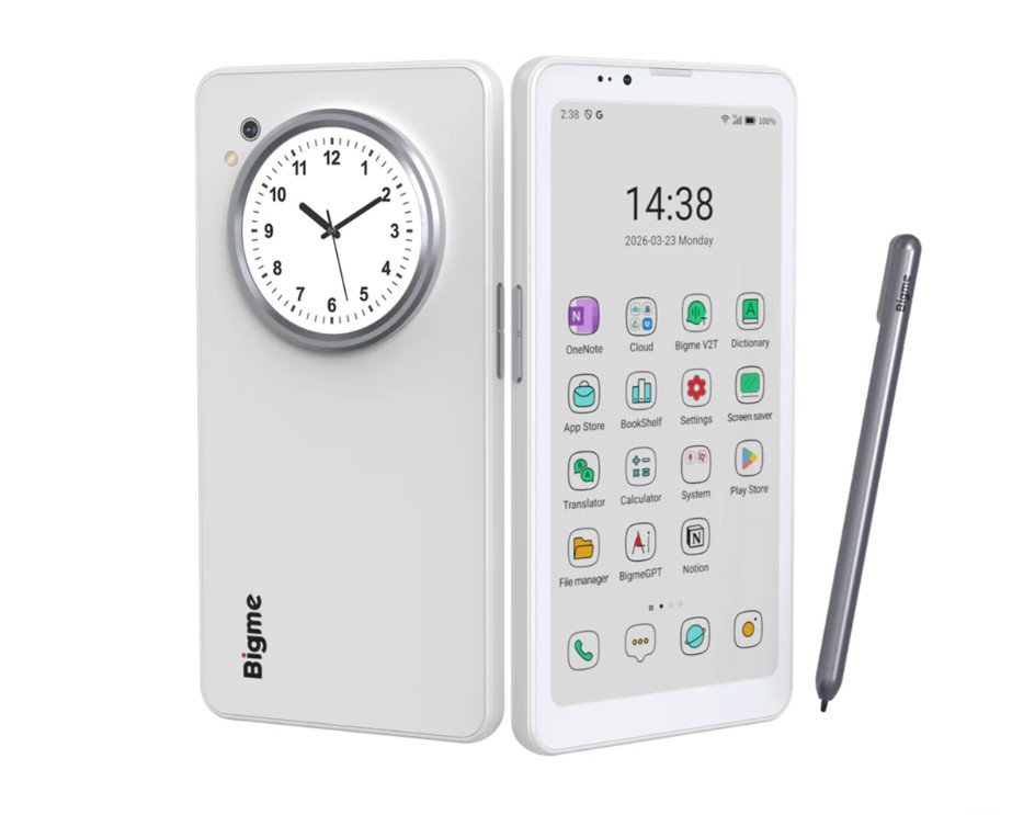 Le smartphone est équipé d'un écran couleur E Ink de 6,13 pouces avec une résolution de 300 PPI en mode noir et blanc et de 150 PPI en mode couleur. D'autre part, l'écran LCD au dos est un écran de 1,85 pouce avec une résolution de 360 × 360. Selon Bigme, l'écran secondaire sert de centre de consultation rapide pour vérifier les notifications ou de viseur pour prendre des photos.