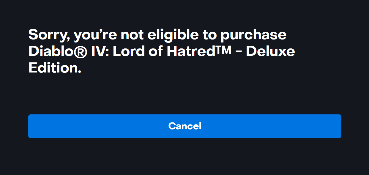 De nombreux utilisateurs (dont moi-même) sur RedditBattle.netXet sur pratiquement toutes les plateformes ne peuvent pas acheter l'extension. Dans un premier temps, les utilisateurs ont été accueillis par un message "Sorry, you're not eligible to purchase Diablo IV : Lord of Hatred - Deluxe Edition" (Désolé, vous n'avez pas le droit d'acheter Diablo IV : Lord of Hatred - Deluxe Edition) sur le client Battle.net. Le client a même changé de devise de manière aléatoire entre-temps. À l'heure où nous écrivons ces lignes, la situation ne semble pas s'être améliorée.