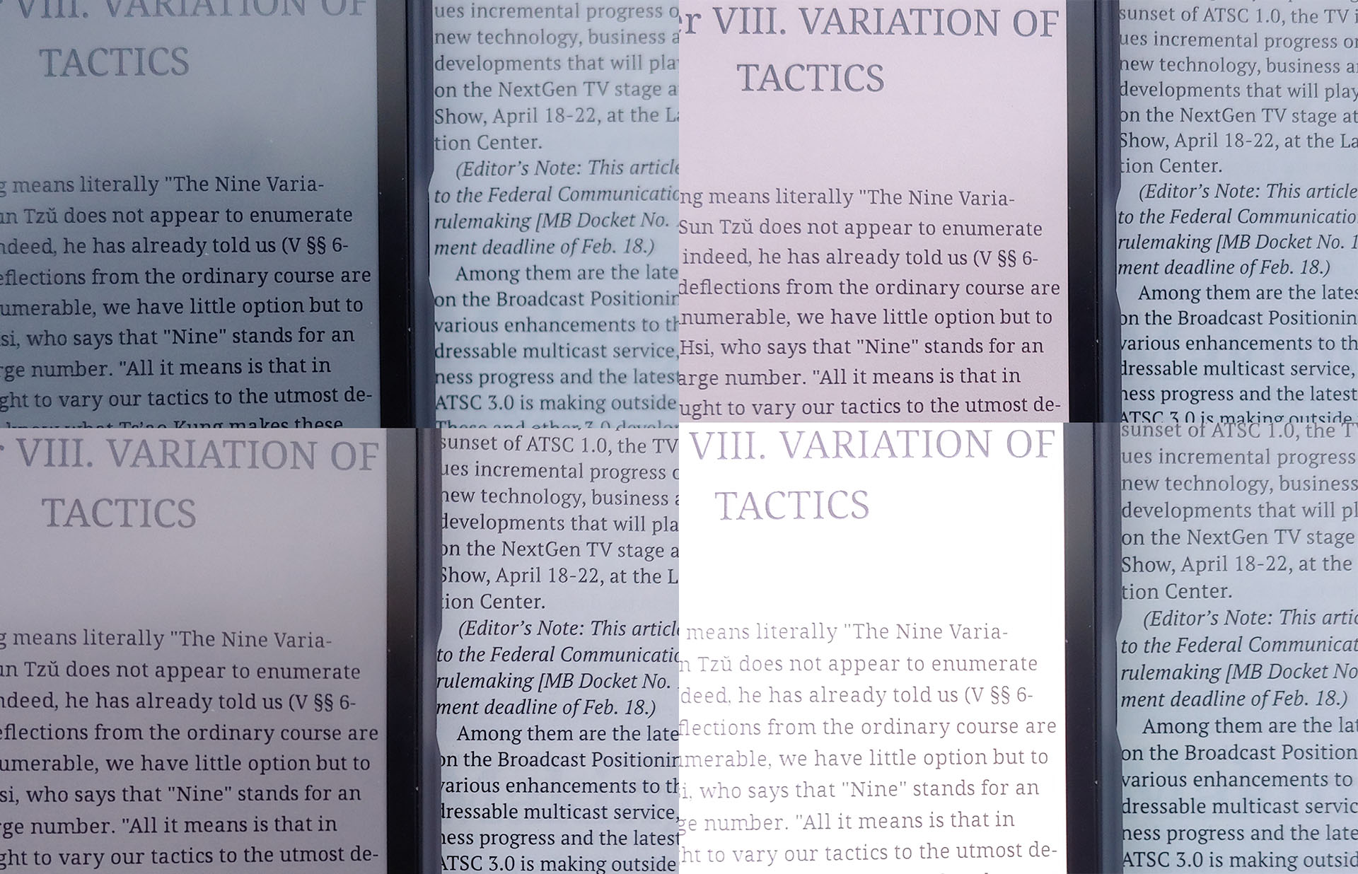 Sa gamme de couleurs et son contraste sont limités par rapport aux magazines, les blancs apparaissant en gris clair et les noirs en gris foncé, mais il reflète la lumière comme les documents imprimés et fonctionne à la lumière du jour sans rétroéclairage. La luminosité du rétroéclairage et la température des couleurs sont réglables pour une utilisation confortable en intérieur.