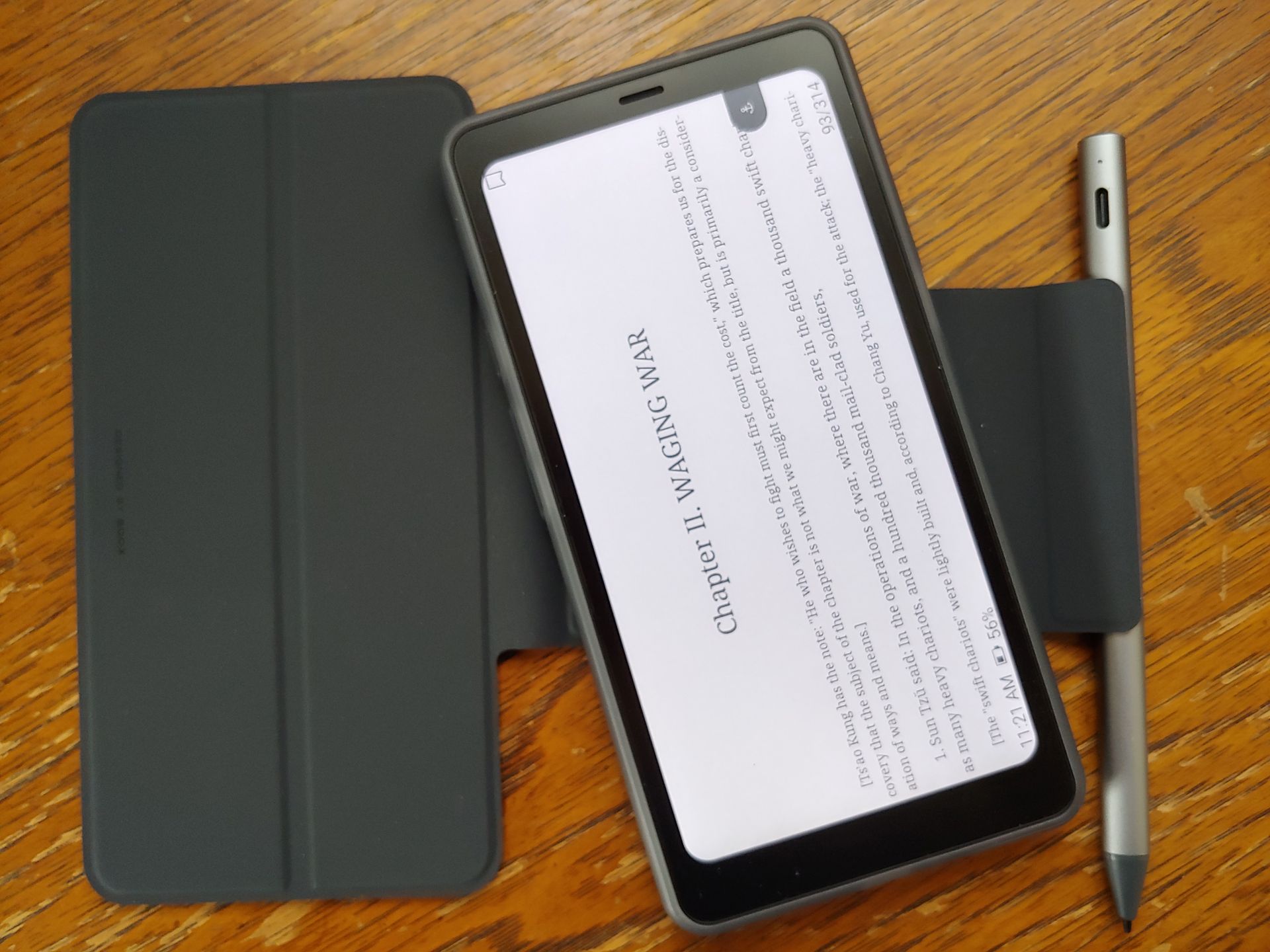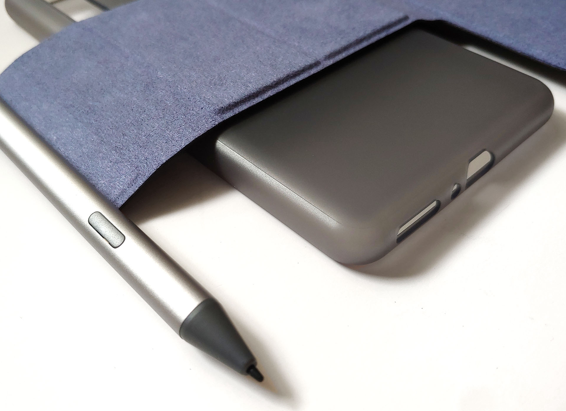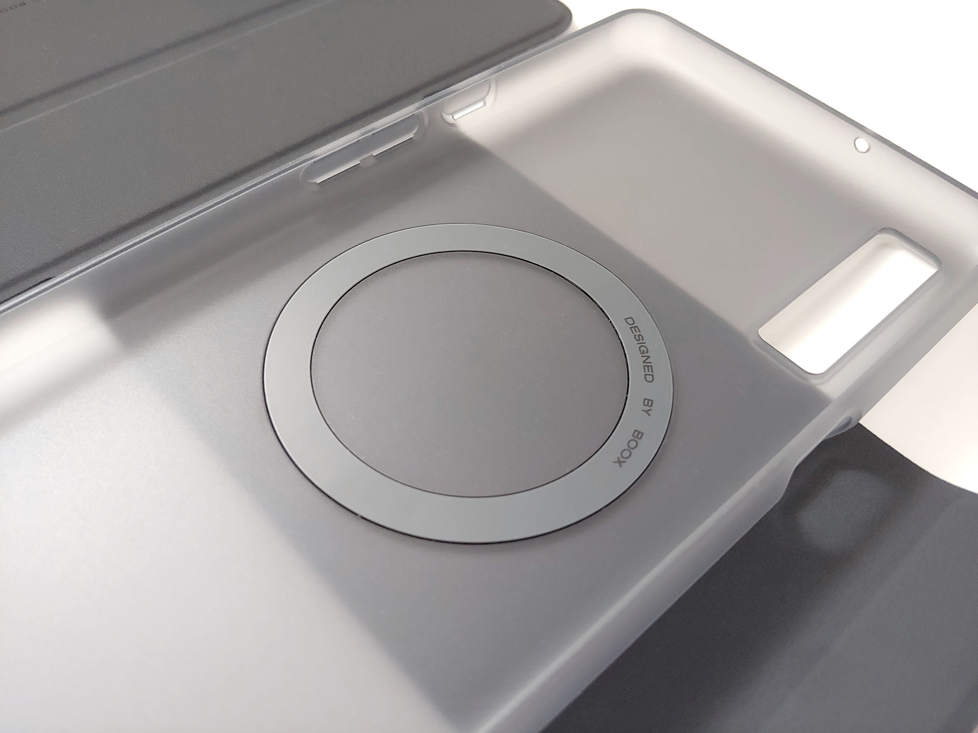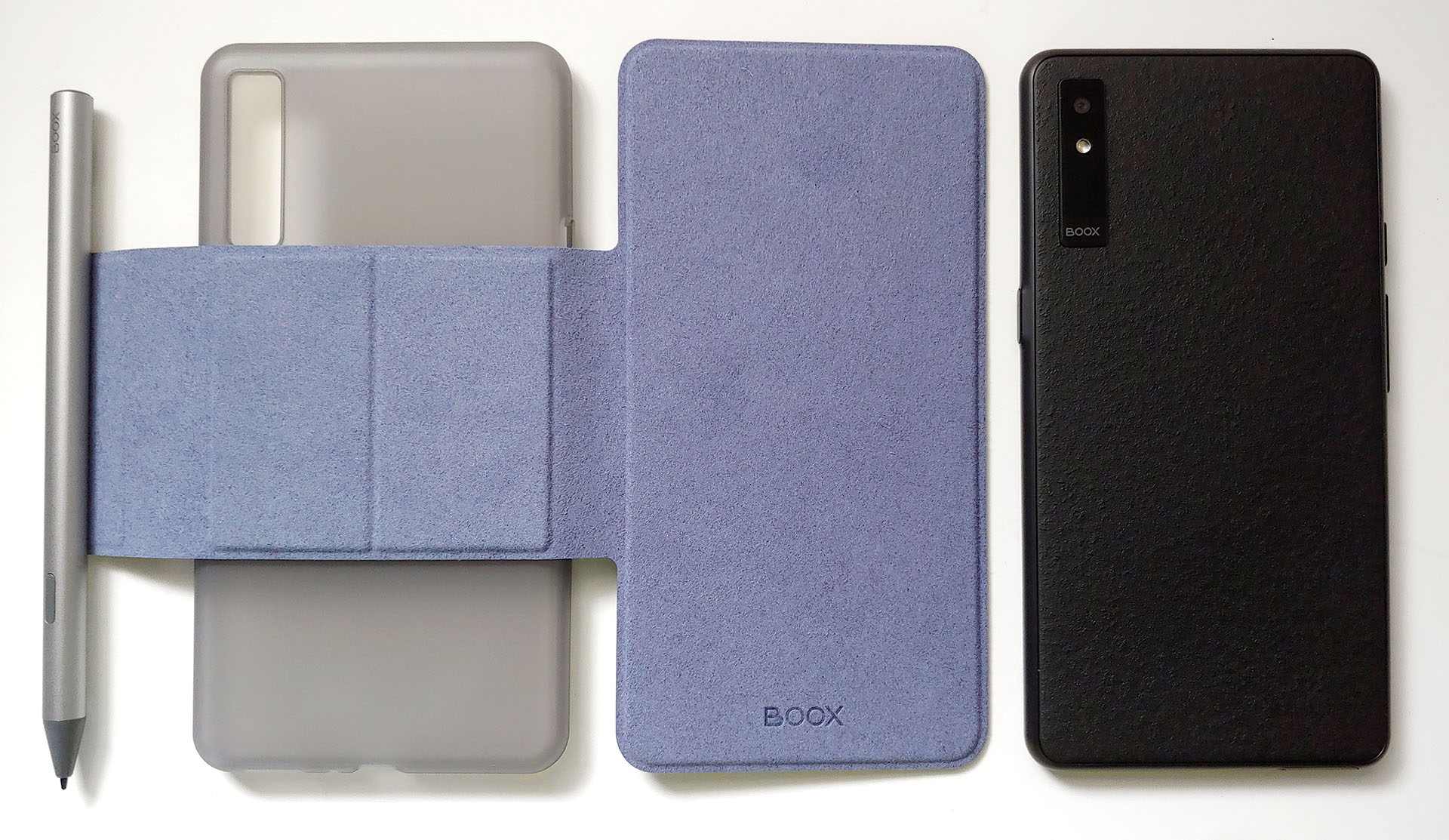 Le lecteur électronique fonctionne avec un stylet magnétique et un étui. Le stylet se fixe sur le dos nu du Boox ou sur le rabat de l'étui. Le Boox s'insère dans l'étui en plastique, puis se fixe magnétiquement au couvercle, qui peut également se détacher assez facilement.