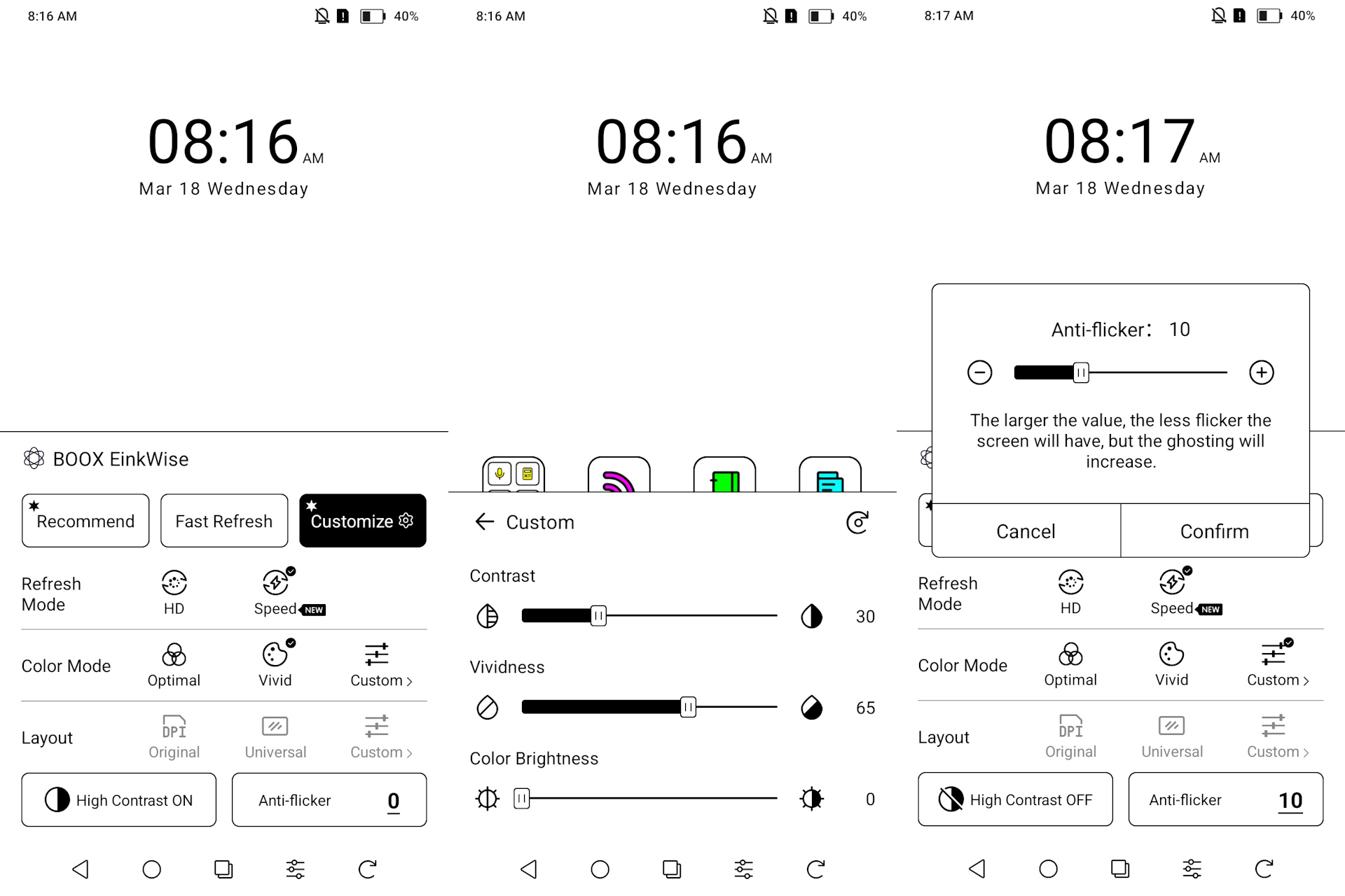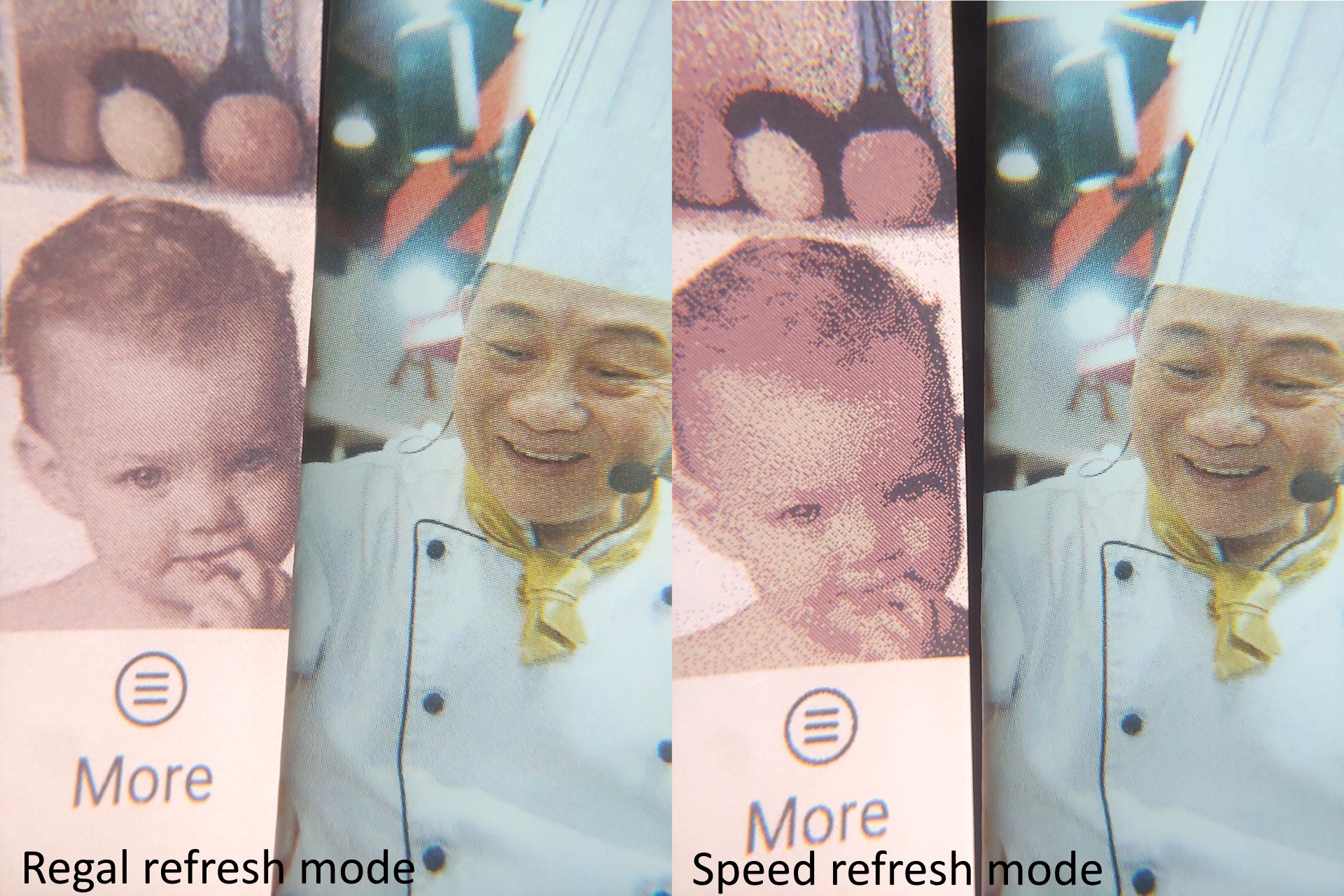 Le mode d'actualisation rapide permet un défilement rapide mais réduit la qualité visuelle, tandis que les modes Regal et HD améliorent la clarté au prix d'interactions plus lentes et d'éclairs inversés occasionnels. La qualité se rapproche de celle d'un journal dans les modes les plus élevés et devient nettement plus rugueuse en mode Rapide.