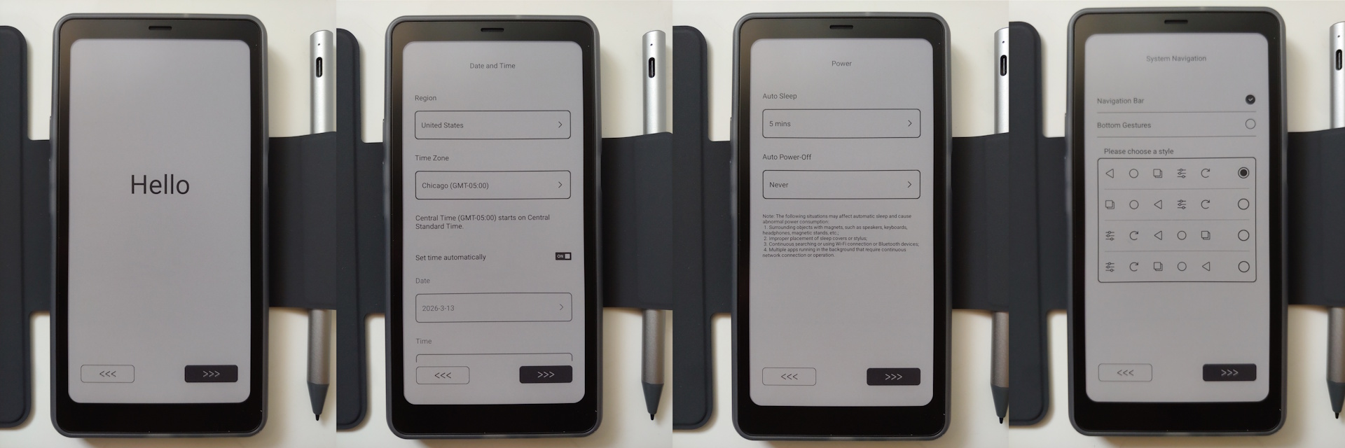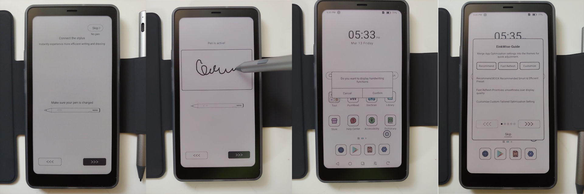 L'installation a été rapide, avec des invites pour la langue, l'heure, l'interface graphique, la configuration du stylo et un tutoriel EinkWise avant d'arriver à l'écran d'accueil avant d'atteindre l'écran d'accueil. Un compte Google n'est pas nécessaire, mais l'assistant AI requiert un compte Onyx.
