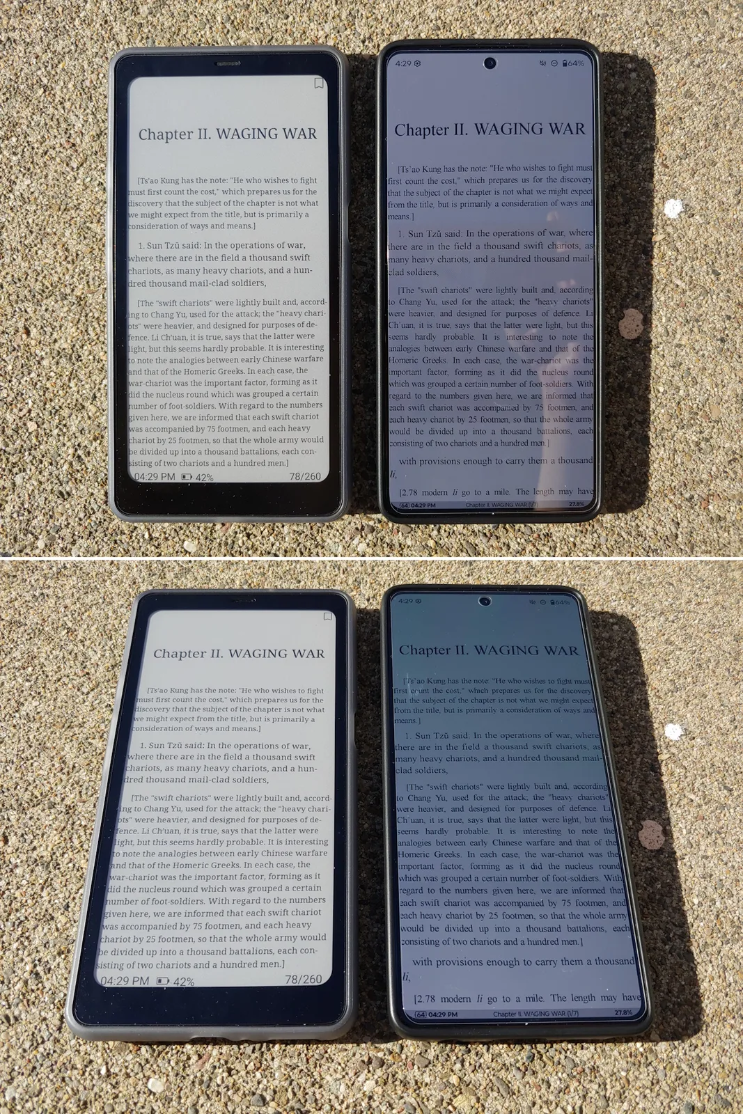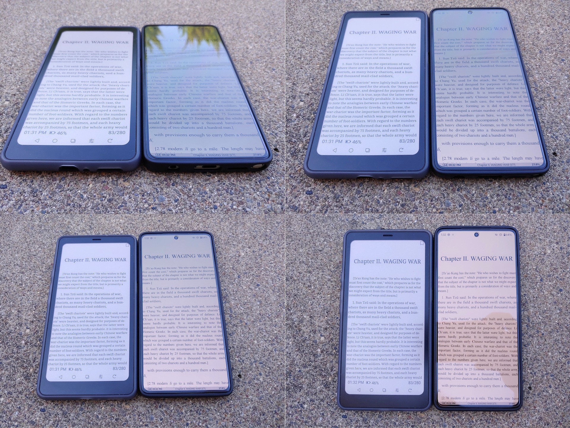 En plein soleil, l'écran du Kaleido 3 est bien plus lisible que celui du Moto G Stylus 2024 OLED à sa luminosité maximale automatique de 1 200 lumens. Dans l'ombre, les deux écrans sont aussi lumineux que le Moto G Stylus 2024 OLED avec sa luminosité maximale manuelle d'environ 550 nits. Le panneau E Ink reste également lisible sous n'importe quel angle sans les reflets ou les changements de couleur de l'OLED.