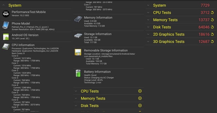 Les tests PassMark suggère que les performances sont comparables à celles d'un Samsung S10 ou d'un A52.
