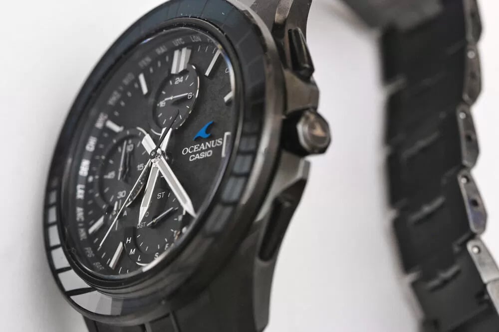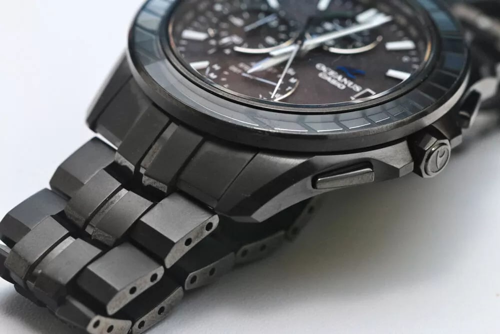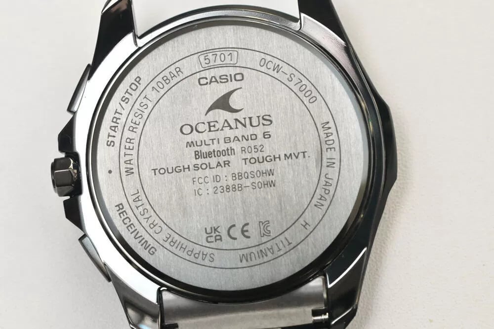 Les photos de profil montrent un boîtier relativement fin compte tenu de la liste des caractéristiques, et la forme des cornes semble convenir à une utilisation confortable. Les poussoirs et la couronne ont une forme nette et anguleuse, et la couronne comporte un symbole Oceanus gravé. Le fond du boîtier indique la présence de Bluetooth, d'une synchronisation radio Multiband 6, de Tough Solar, d'un verre saphir et d'une résistance à l'eau de 10 bars.