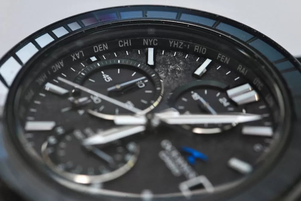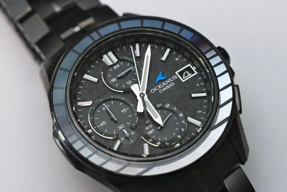 Le cadran est également plus intéressant sur ces photos réelles. Au lieu d'être plate et uniforme, la surface a un aspect texturé, presque pierreux, qui change sous l'effet de la lumière. Les sous-cadrans et les index ressortent plus clairement, et le guichet de date encadré à quatre heures semble beaucoup plus raffiné en personne. Le logo bleu vif de la vague Oceanus est frappant sur le fond noir - beaucoup plus visible que sur les images de presse originales.