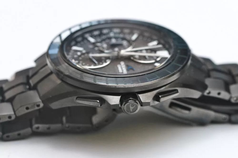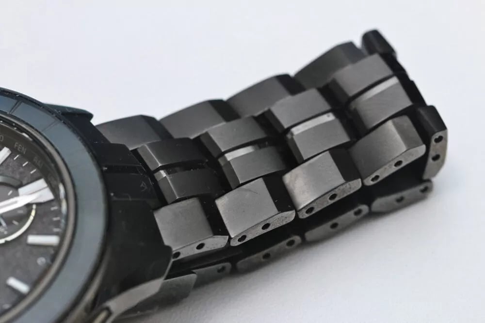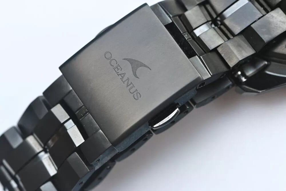 La première chose qui attire l'attention est le boîtier et le bracelet. La montre semble être entièrement construite en titane avec une finition DLC noire, et les gros plans montrent des arêtes plus vives et un usinage plus complexe qu'à l'accoutumée. Les maillons du bracelet présentent des facettes nettement anguleuses et le brossage semble profond plutôt que légèrement peint. La photo du fermoir montre également un logo Oceanus joliment gravé, avec une texture mate qui complète le polissage réfléchissant qui l'entoure.