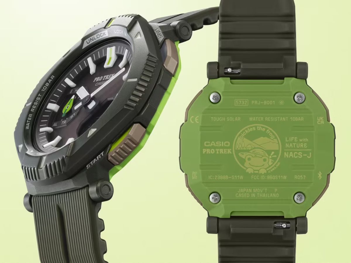 Casio a dévoilé la montre de collaboration Pro Trek x The Nature Conservation Society of Japan x Pickles the Frog au Japon. Également connue sous le numéro de modèle PRJ-B001NJ-3JR ou PRJ-B001NJ-3, cette montre a un design vert, avec des clins d'œil au personnage populaire de la grenouille, qui est la mascotte de la Société de conservation de la nature.
