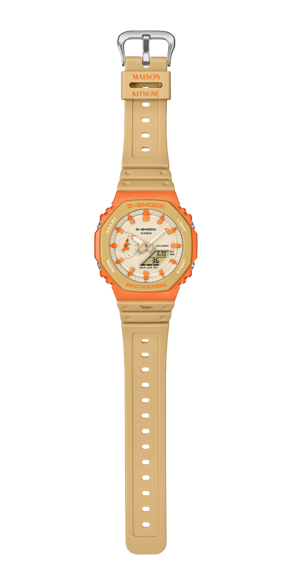 La Casio G-Shock GA-2110MK-5A présente une palette camaïeu, inspirée de l'architecture parisienne d'Haussmann. Le design est centré sur le motif du renard de Maison Kitsuné, que l'on retrouve sur le sous-cadran du jour de la semaine. La lunette de la montre et divers accents sur le cadran plus clair sont d'un orange vif assorti. La montre en résine mesure 48,5 x 45,4 x 11,8 mm (~1,91 x 1,79 x 0,46 pouces), avec une lunette orange frappante, et le bracelet comporte le logo Maison Kitsuné.