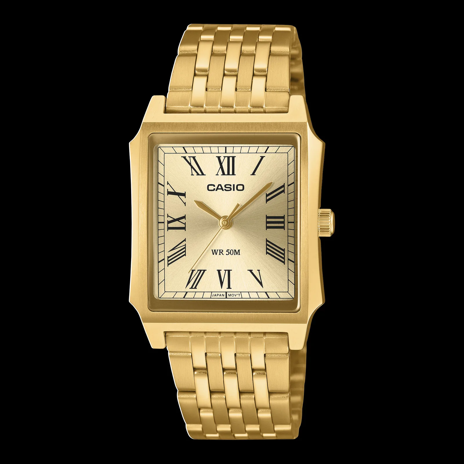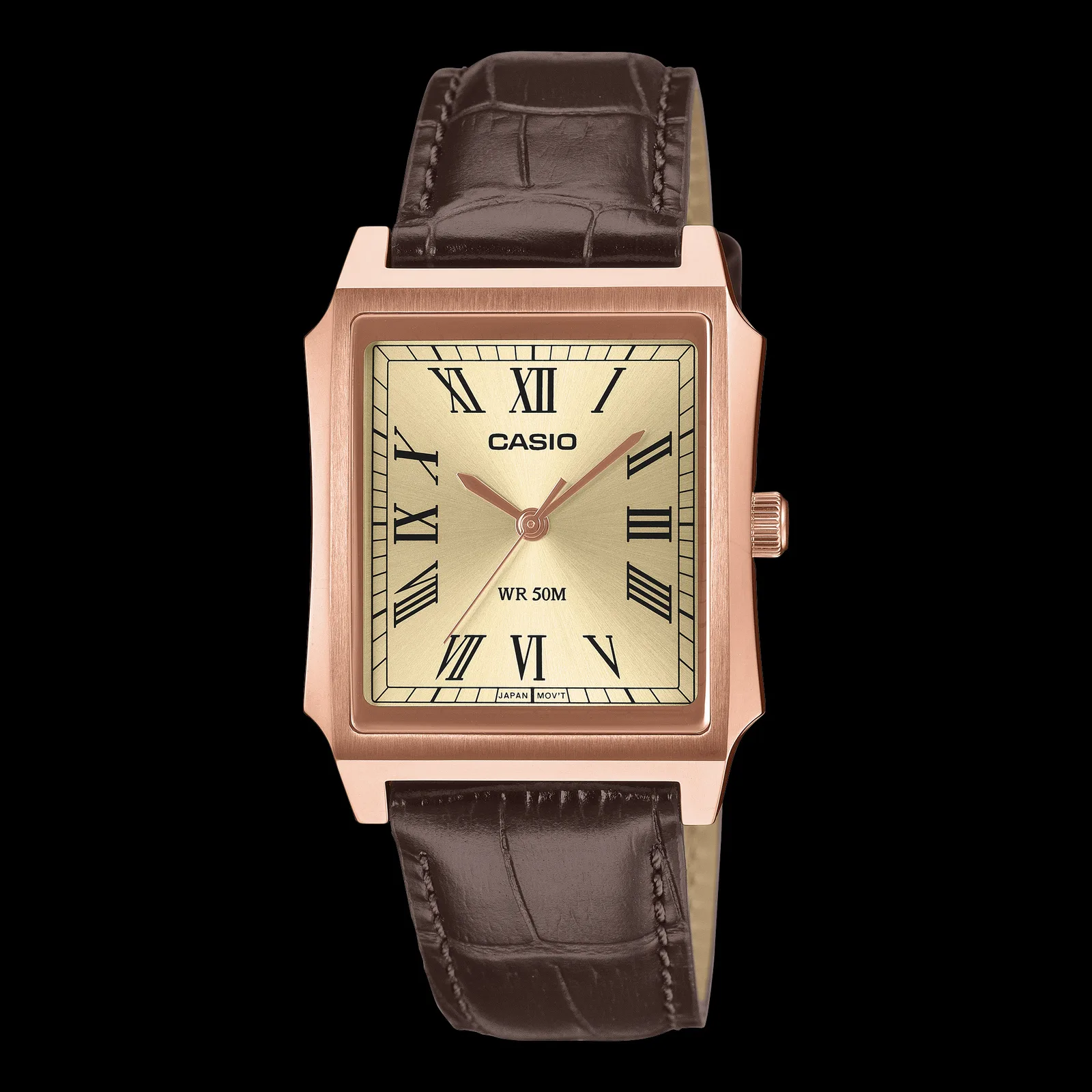 La MTP-B190L-7BV est dotée d'un bracelet en cuir véritable et d'un boîtier de couleur argentée. La MTP-B190RGL-9BV est dotée d'un boîtier plaqué or rose et d'un bracelet en cuir marron. Pour les options de bracelet, la MTP-B190SG-9BV utilise un bracelet en acier inoxydable avec placage ionique or et un fermoir triple à pression unique. La MTP-B190G-9BV est dotée d'un boîtier et d'un bracelet plaqués or.