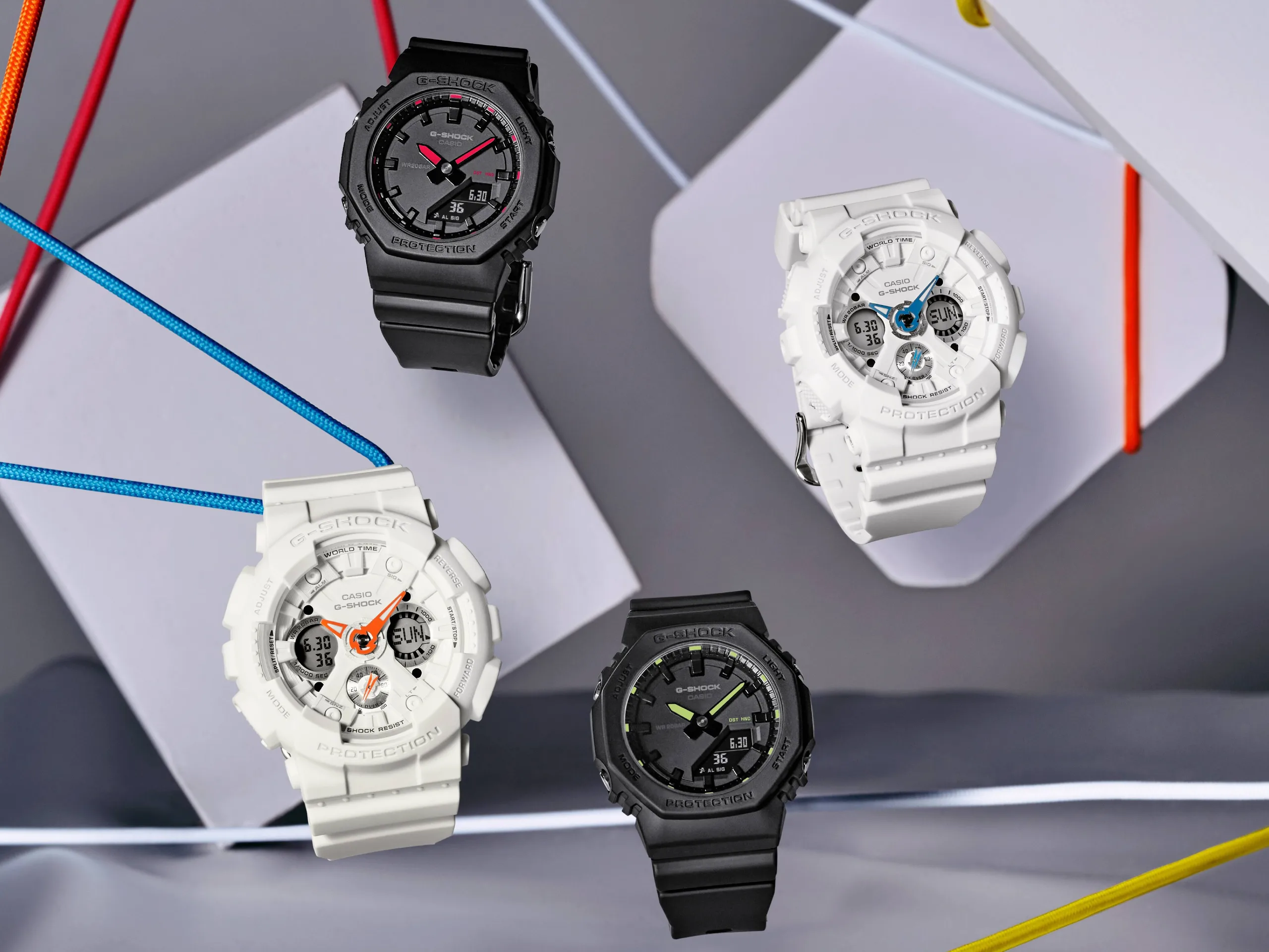 Les GMA-S120SA sont également des montres hybrides, bien qu'elles soient dotées de deux écrans numériques plus petits et d'un cadran indicateur. Ce modèle prend en charge 29 fuseaux horaires avec une fonction Home City et est antimagnétique. Les caractéristiques de ce modèle comprennent un chronomètre au 1/1000e de seconde, un compte à rebours, cinq alarmes et un rétroéclairage par LED ambrée. Les deux montres sont entièrement blanches et dotées d'une imposante lunette ronde. Les seuls éléments non blancs sont les aiguilles de la montre et l'indicateur de cadran, qui sont orange pour la GMA-S120SA-7A1 et bleus pour la GMA-S120SA-7A2.