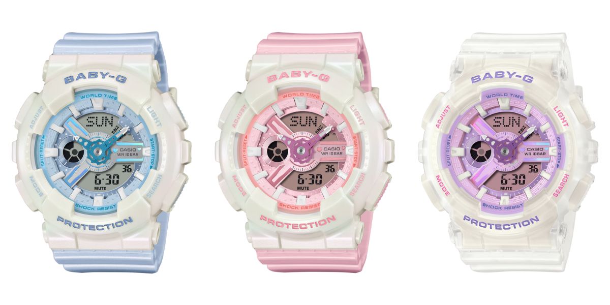 Trois nouvelles montres Casio G-Shock Baby-G BA-100 ont été lancées au Japon ont été lancées au Japon. La BA-110PD-2A, la BA-110PD-4A et la BA-110PS-7A, dont le design est de couleur pastel, sont commercialisées comme étant "très pratiques et très fonctionnelles".