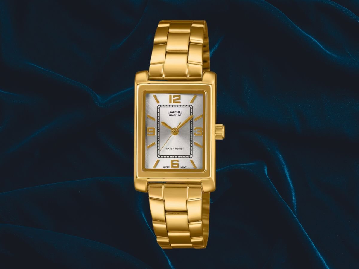 La LTP1234PGC-7A de Casio est un sosie de la Tank de Cartier, avec un cadran rectangulaire et un bracelet fin. Cette montre possède un boîtier et une lunette en acier inoxydable plaqué or, ainsi qu'un bracelet en acier inoxydable assorti, doté d'un fermoir à trois volets à pression unique. Elle mesure 32,0 x 21,0 x 7,4 mm (~1,3 x 0,8 x 0,3 pouces) et pèse 56 g (~2,0 oz).