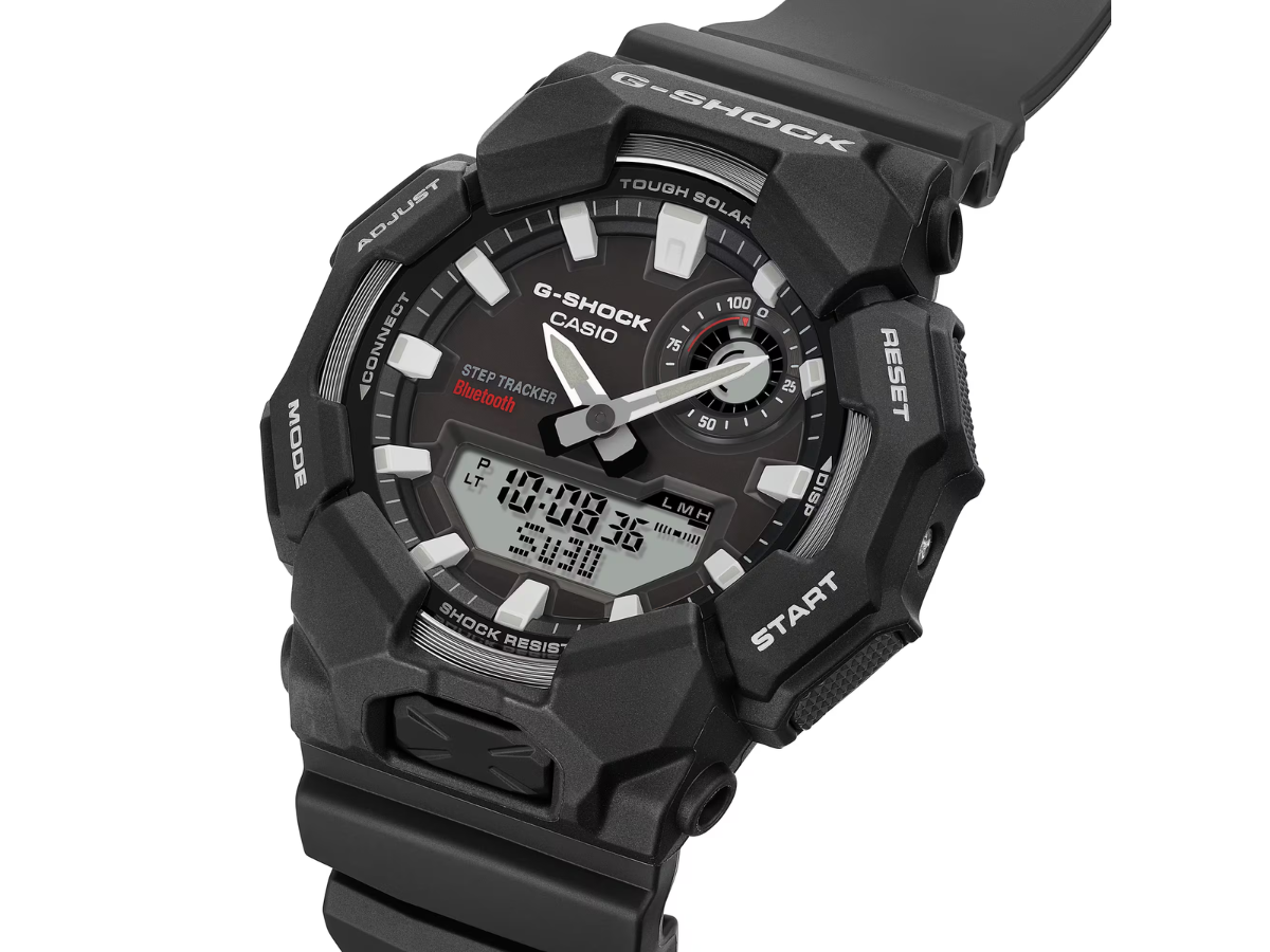 La GA-B010 de Casio est une montre hybride, dotée de deux aiguilles analogiques, d'un affichage numérique plus petit et d'un cadran indiquant votre progression vers votre objectif de pas. Parmi les autres fonctions liées aux pas, citons les rappels de pas et l'enregistrement des données dans l'application Casio Watches pour smartphone, grâce à la connectivité Bluetooth. Dans l'application, vous pouvez également accéder à des outils tels que l'ajustement automatique de l'heure et la recherche de téléphone. Ces montres prennent en charge l'heure universelle, avec un choix de 55 villes, et des fonctions telles qu'un compte à rebours, des signaux horaires, un chronomètre au 1/100e de seconde et cinq alarmes quotidiennes. De plus, ce modèle offre un système de chargement Tough Solar et une résistance à l'eau de 200 m.