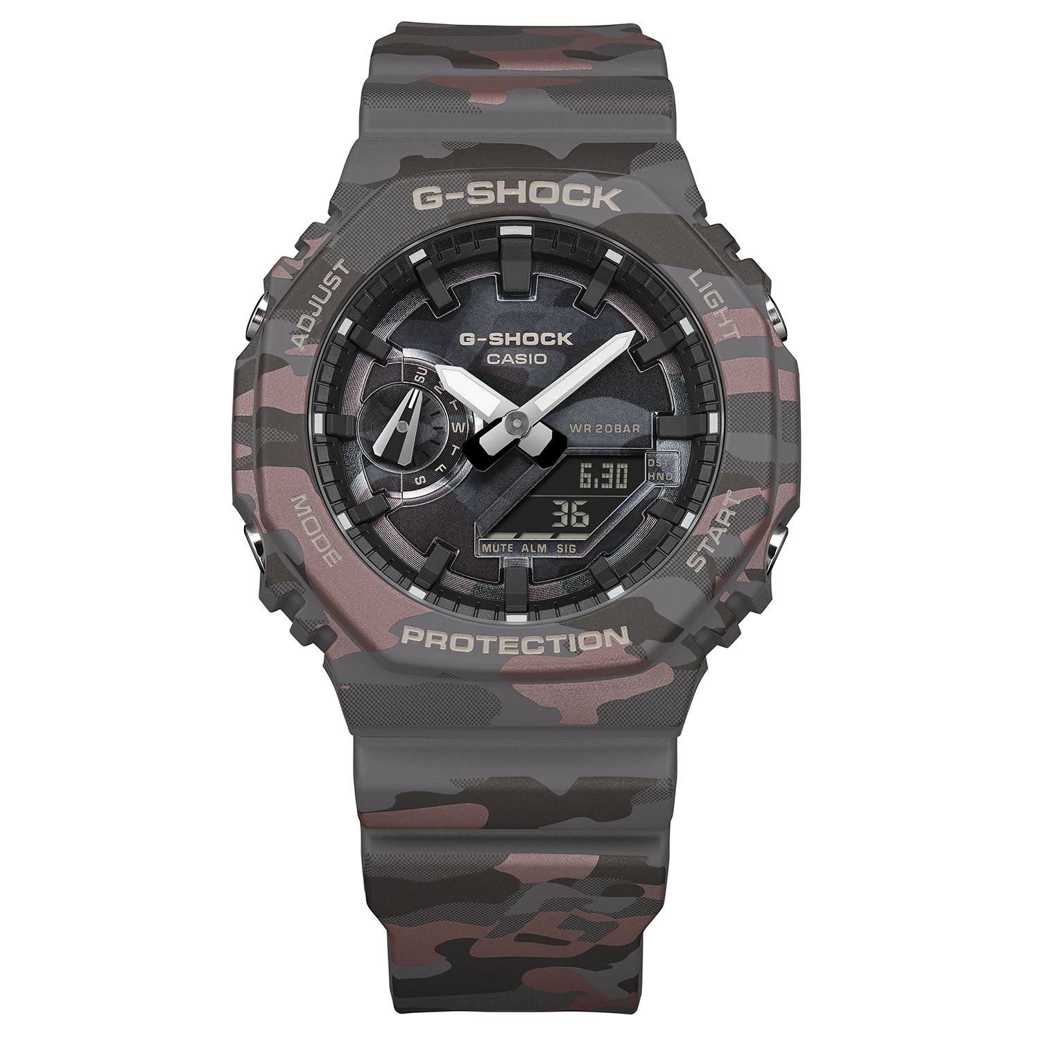 La série GA-2100 de Casio, caractérisée par sa lunette octogonale et son affichage hybride analogique-numérique, reçoit officiellement trois nouveaux coloris : sable (GA-2100CM-5), gris (GA-2100CM-8) et une troisième variante aux tons rougeâtres (GA-2100CMD). Les composants en résine sont également imprimés de façon métallique. Ce processus de fabrication permet d'obtenir un effet de camouflage multicouche qui inclut l'identifiant de la marque - le G-mark - directement intégré dans le motif. Alors que les versions précédentes du GA-2100 utilisaient de la résine colorée moulée ou une tampographie standard, l'utilisation de détails métalliques sur ces modèles a pour but d'apporter une plus grande profondeur visuelle par rapport aux variantes standard.