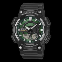 Pour les utilisateurs qui souhaitent obtenir plus de données de leur montre, la AEQ-110W-3A2V est dotée d'un affichage hybride analogique-numérique. Sa principale caractéristique technique est un cycle de batterie de 10 ans alimenté par une pile CR2025. Le module comprend des fonctions anciennes telles qu'une base de données Telememo de 30 entrées et la prise en charge de l'heure universelle pour 30 villes. Avec ses 16,7 mm, c'est le modèle le plus épais de la collection, ce qui est plutôt une nécessité en raison de l'empilement interne requis pour l'écran LCD et les aiguilles mécaniques. Malgré tout, elle conserve la résistance à l'eau de 100 mètres du modèle analogique.