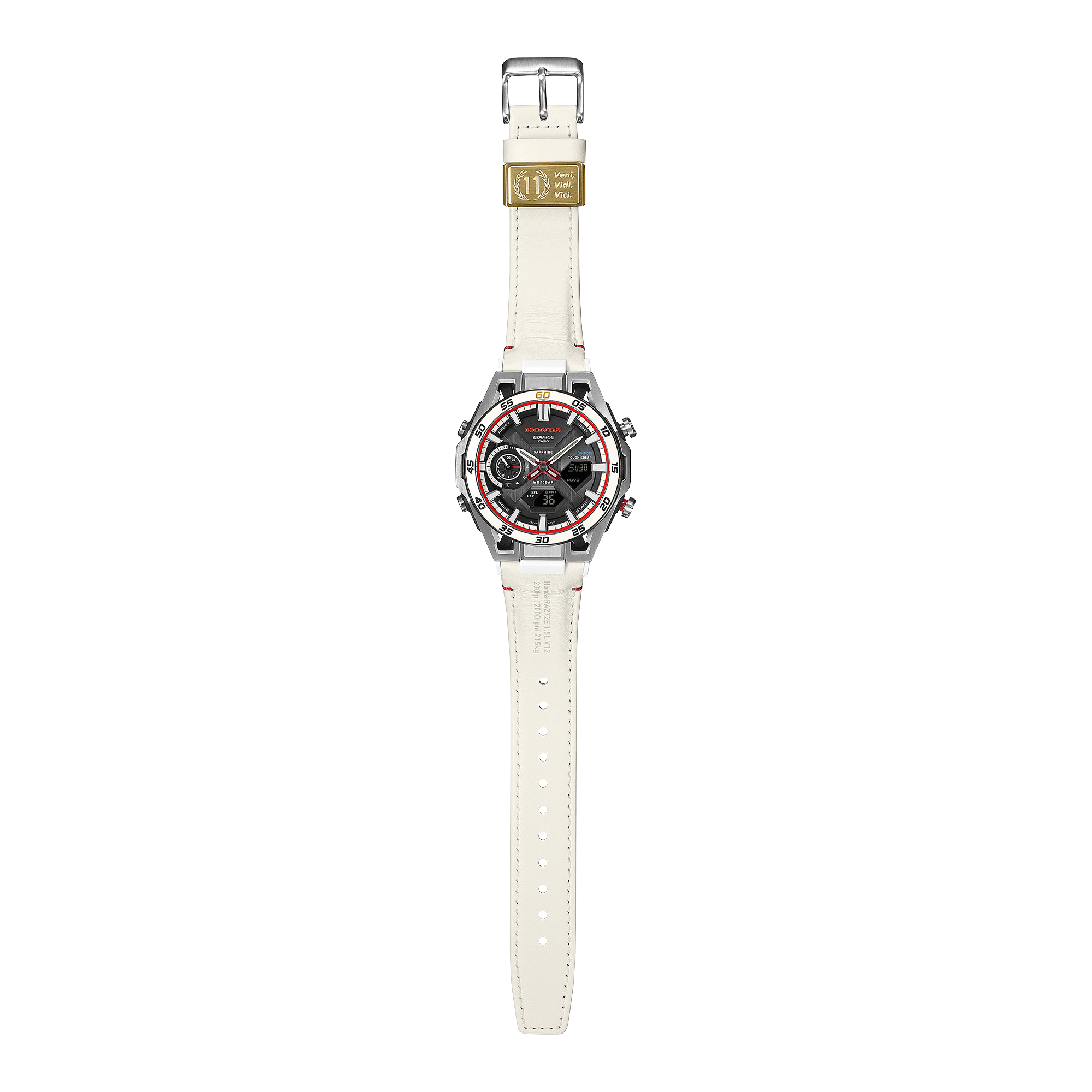 La Casio Edifice Sospensione ECB-2300HR-1A présente un design blanc, noir et rouge, célébrant les 30 ans de la première victoire de Honda en F1, en 1965 lors du Grand Prix du Mexique avec la RA272. La couleur de la carrosserie de la voiture, appelée Championship White, est utilisée pour la lunette et le bracelet en cuir de la montre. Autre clin d'œil à la victoire, l'aiguille des 60 minutes est dorée et les mots "Veni, Vidi, Vici" sont gravés sur la boucle du bracelet. Ce modèle est doté d'un verre saphir et est étanche à 100 mètres.