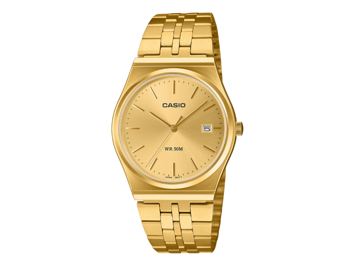 La MTPB145GC-9AV est une montre entièrement en or, que Casio décrit comme ayant un design rétro inspiré des années 80. Le boîtier, le cadran et le bracelet de la montre sont en acier inoxydable plaqué or. Elle mesure 40,0 x 35,0 x 7,4 mm (~1,57 x 1,38 x 0,29 pouces) et pèse 82 g (~2,9 oz).