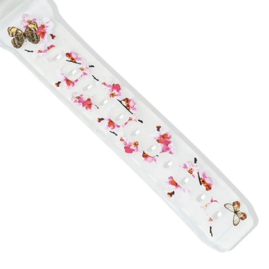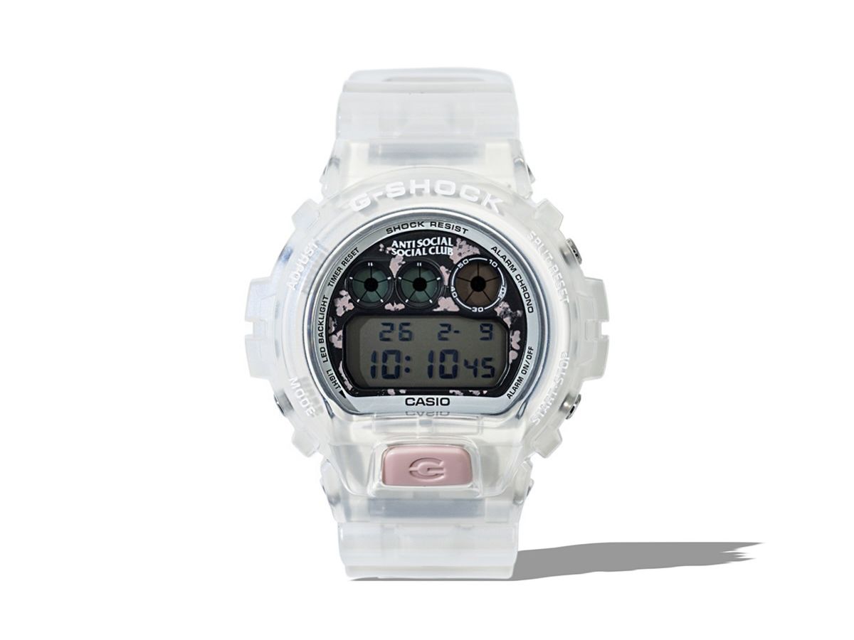 La nouvelle G-Shock x Anti Social Social Club DW-6900 est une montre squelette dotée d'une lunette translucide qui révèle un boîtier blanc. Celui-ci entoure un cadran noir orné d'un motif de fleurs de cerisier rose pâle, avec un bouton "G" rose assorti. Le bracelet transparent est décoré de fleurs et de papillons roses, selon le célèbre design Kkotch de la marque. De plus, lorsque les utilisateurs allument le rétroéclairage LED, les mots "Get Weird" s'affichent en arrière-plan de l'écran numérique plus grand.