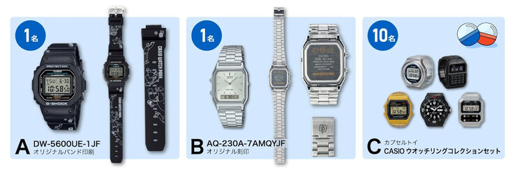 Les prix comprennent un DW-5600UE-1JF avec un bracelet imprimé spécial (un gagnant), un AQ-230A-7AMQYJF avec une gravure originale (un gagnant), et des ensembles de collection de jouets Casio pour dix gagnants. L'éligibilité dépendra de la disponibilité des identifiants Casio dans la région de l'utilisateur ; aucune restriction spécifique par pays n'a été annoncée.