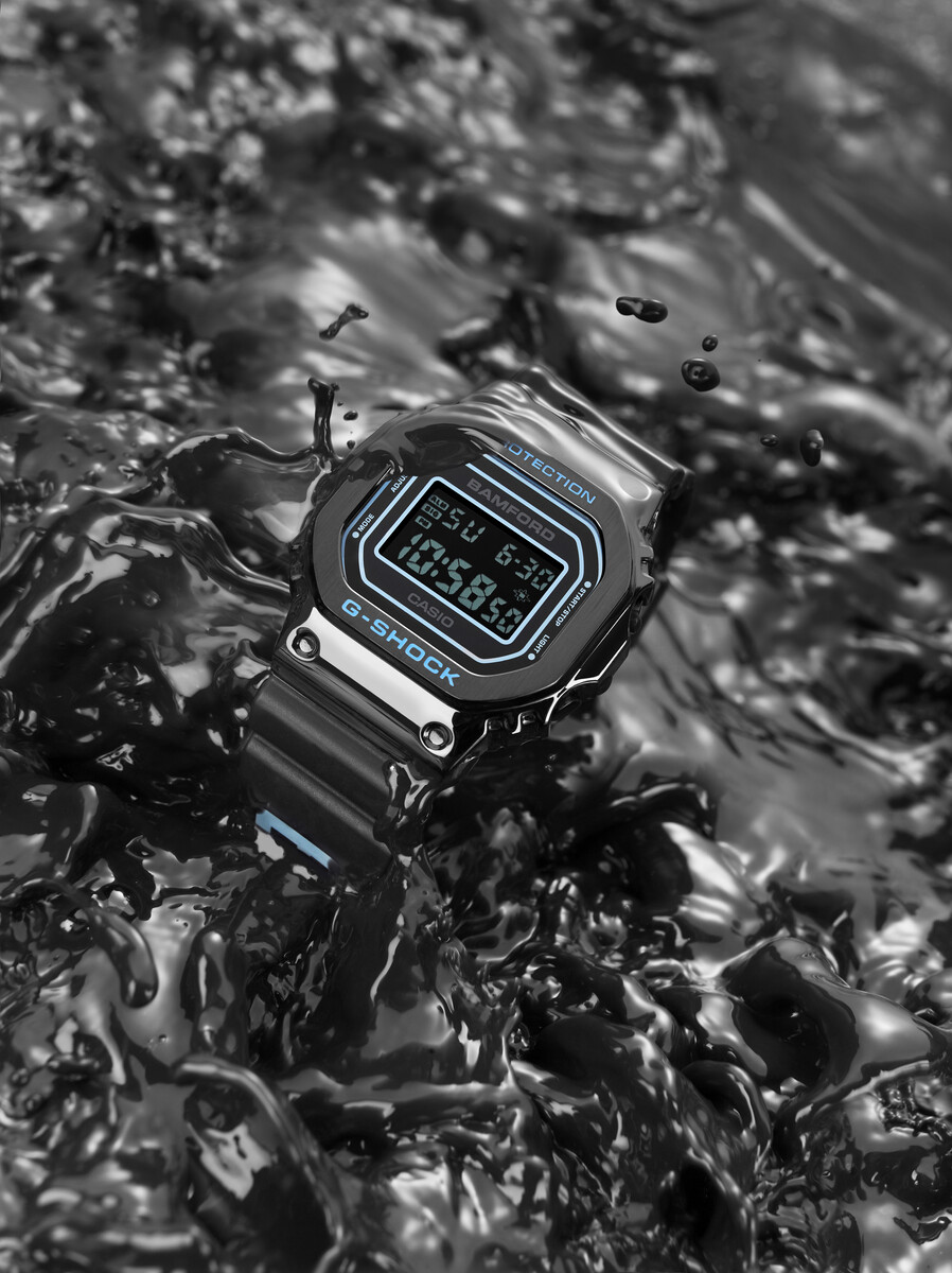 Alors que l'annonce initiale se concentrait sur l'essentiel - une finition noire polie, un écran LCD négatif et les accents bleu clair caractéristiques de Bamford - ces nouvelles images nous donnent une idée un peu plus précise de la personnalité de la montre. Une photo spectaculaire du produit place la GM-5600 dans un liquide noir épais. Un autre cliché capture la montre qui semble fondre ou couler, révélant l'éclat de son extérieur brillant. Les deux images montrent le contraste esthétique entre la marque Bamford mate sur le bracelet et le boîtier métallique poli.