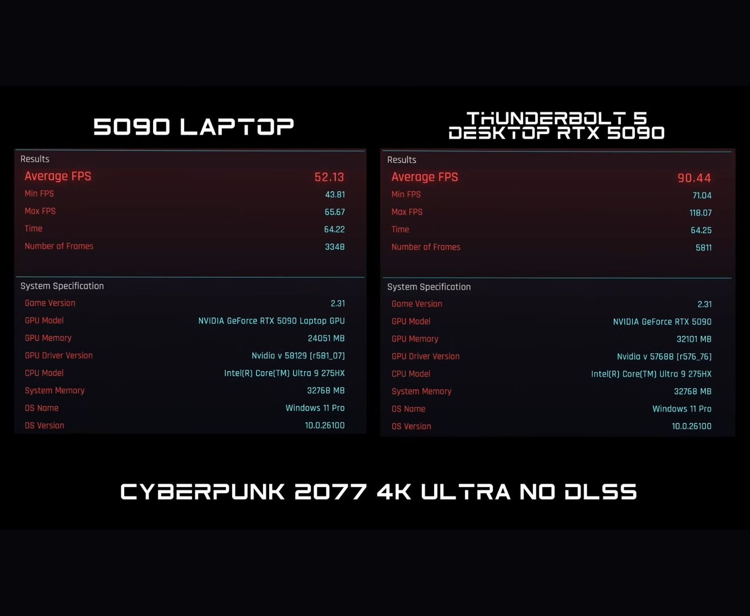 C'est en testant Cyberpunk 2077 que nous avons pu voir la plus grande différence entre les deux configurations. En 4K Ultra sans DLSS, le GPU RTX 5090 pour ordinateur portable a obtenu un score de 52 FPS. En revanche, la RTX 5090 via le dock eGPU a obtenu un score de 90 FPS. La différence de TGP est également significative, puisque la RTX 5090 pour ordinateur portable consomme environ 170 W, tandis que la station d'accueil Razer eGPU consomme environ 460 W.