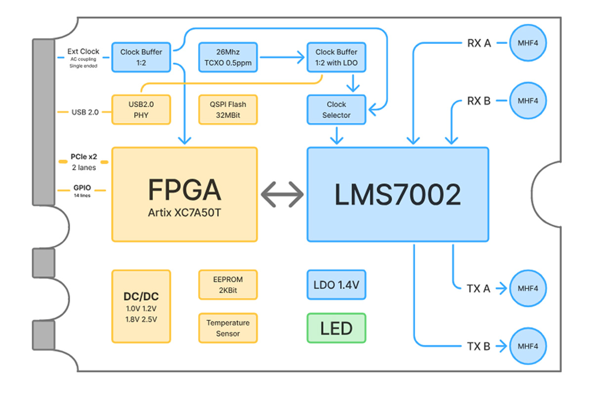 Le xSDR est basé sur l'émetteur-récepteur RF Lime Microsystems LMS7002M, associé à un FPGA AMD Artix-7 XC7A50T. Cette combinaison couvre une plage d'accord de 30 MHz à 3,8 GHz. La SDR prend en charge des taux d'échantillonnage de 0,1 MSPS à 122,88 MSPS en mode SISO et plus de 80 MSPS en mode MIMO, avec des largeurs de bande de canal allant de 0,5 MHz à 90 MHz. Quatre connecteurs d'antenne MHF4 permettent d'accéder aux deux canaux RX et aux deux canaux TX.