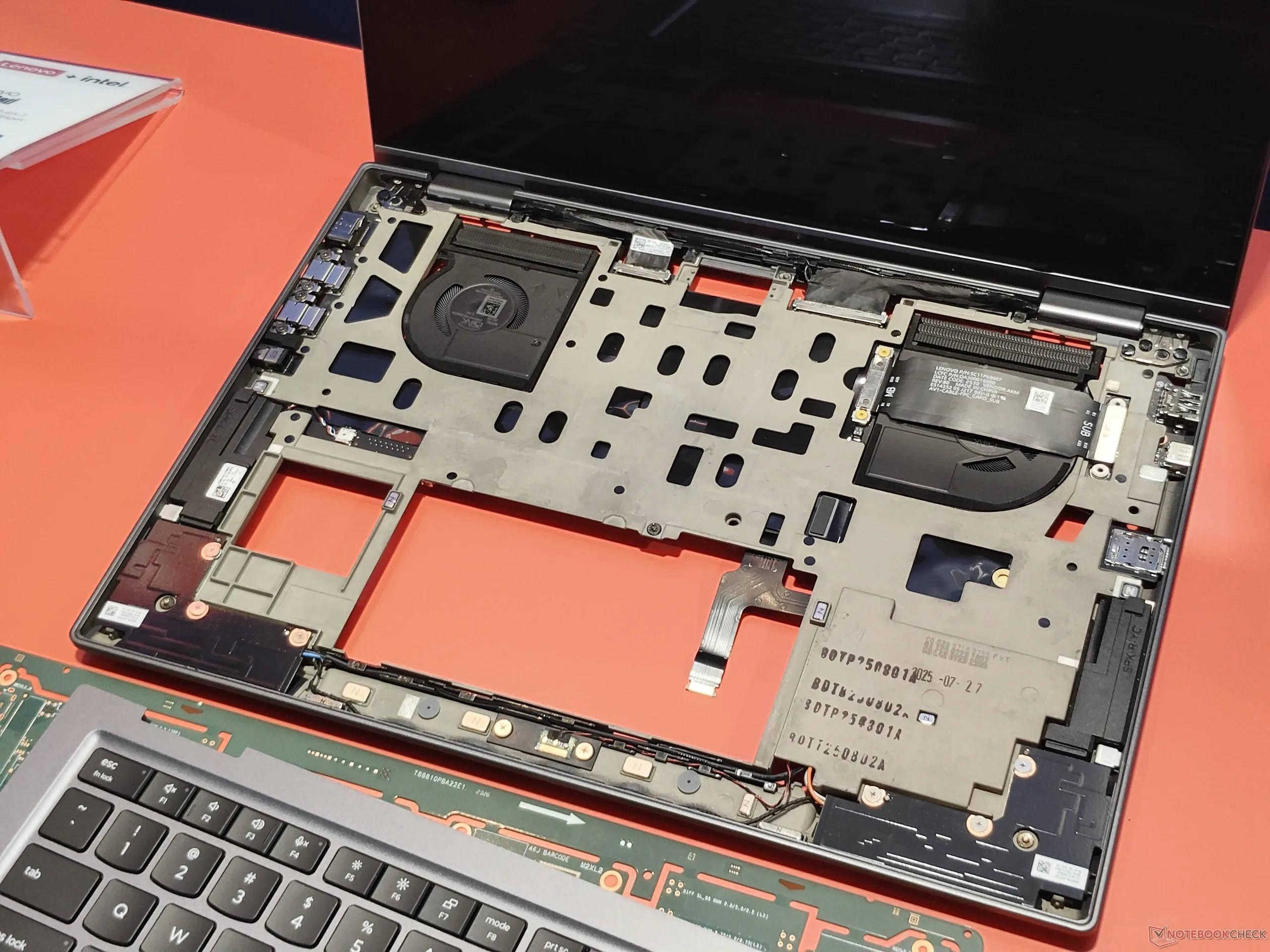 Un autre avantage est la meilleure utilisation de l'espace disponible, d'où le terme "cadre spatial". En plaçant certains composants de l'autre côté du nouveau cadre central, comme les connecteurs d'écran et les antennes Wi-Fi, Lenovo a pu libérer un espace précieux, qui a été utilisé pour augmenter la taille du système de refroidissement - permettant de refroidir jusqu'à 30 W à pleine charge au lieu de seulement 22,5 W sur le précédent X1 Carbon Gen 13(disponible sur Amazon). Ceci est particulièrement pratique avec les nouveaux CPU Panther Lake, car l'Intel Core Ultra X7 a besoin de plus d'énergie pour être nettement plus performant que les CPU Lunar Lake précédents. De plus, avec la nouvelle carte mère plus petite, Lenovo a pu rendre les ports USB C modulaires et placer certains des autres ports sur une carte fille séparée.