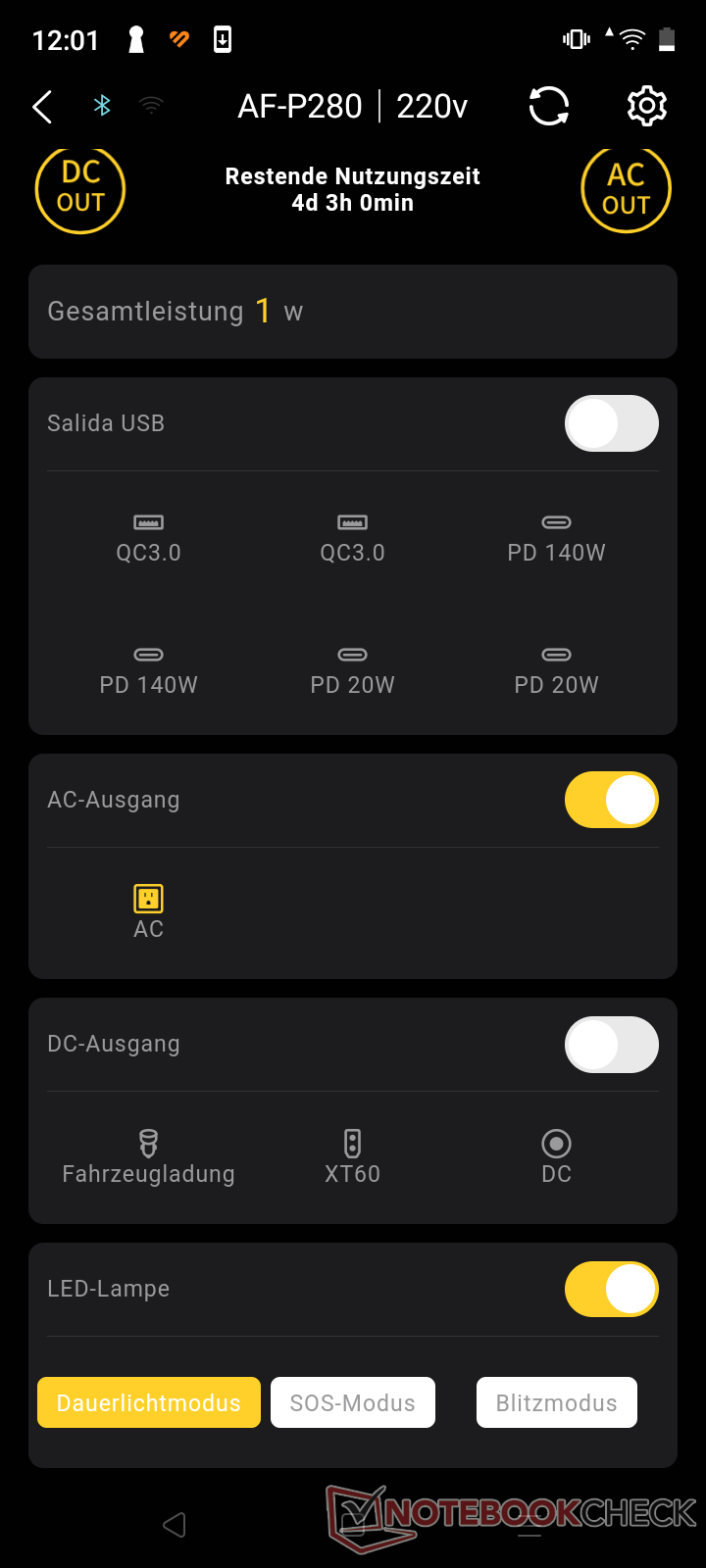 Pendant la charge en courant alternatif, la Powerstation a atteint les 1 800 W promis dès le début et jusqu'à 60 %. Après environ 65 minutes, 80 % de la batterie était chargée et 50 minutes plus tard, le processus de charge était terminé. Le processus de charge solaire n'a pu être testé que de manière limitée en raison du manque d'ensoleillement de l'hiver actuel à Hambourg. Avec la charge et la décharge en courant continu (DC), l'efficacité est généralement plus élevée car il n'y a pas de pertes de conversion en courant alternatif.