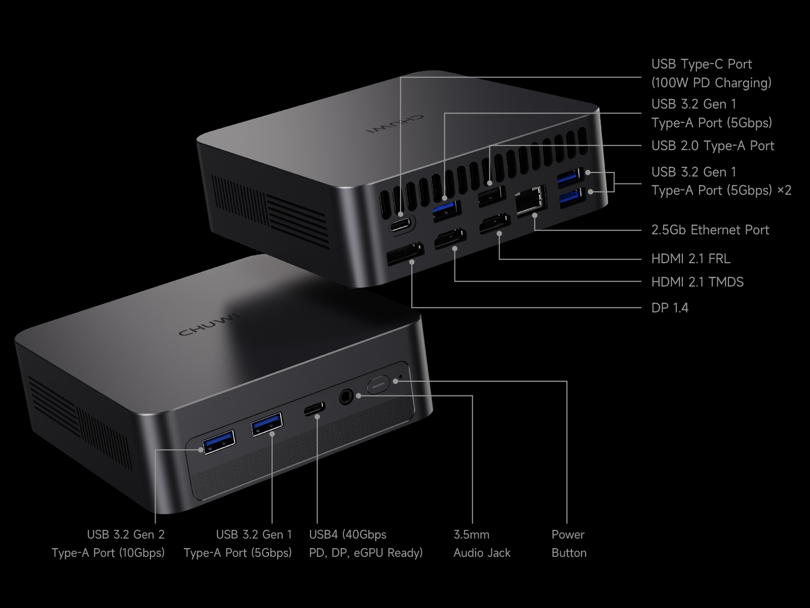 Plus précisément, il dispose de 8 cœurs Battlemage et, d'après nos benchmarks, d'une puissance de calcul de 1,5 million d'euros d'après nos benchmarksl'Arc 140V peut faire tourner presque tous les jeux AAA en 1080p low preset à environ 30 FPS ou plus. La Chuwi AuBox X dispose d'un port USB4, qui apporte le support de l'eGPU (Minisforum DEG 2 actuellement à 239$ sur Amazon), mais il aurait été préférable de voir un port OCuLink également.