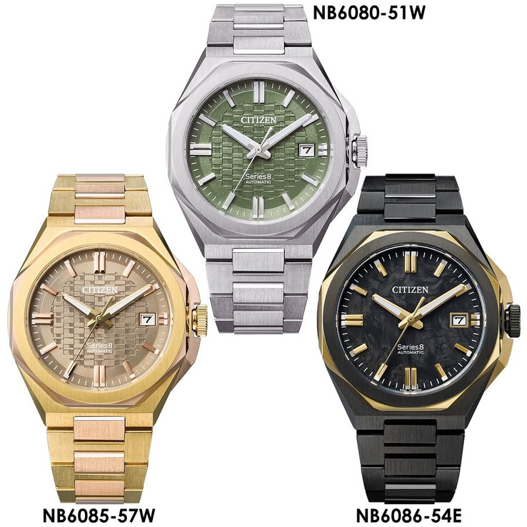Citizen a le vent en poupe et élargit sa gamme Series 8 avec la sortie des NB6080-51W, NB6085-57W et d'une référence en édition limitée, la NB6086-54E. Ces modèles sont plus petits que les précédentes variantes de 42 mm, grâce à un diamètre de 39,3 mm qui répond aux tendances actuelles du marché. Le boîtier est constitué de cinq éléments distincts en acier inoxydable, tous polis pour obtenir une finition à angles multiples. L'une des principales caractéristiques techniques est l'épaisseur de 10,4 mm, qui permet de maintenir une étanchéité de 20 bars (200 mètres).