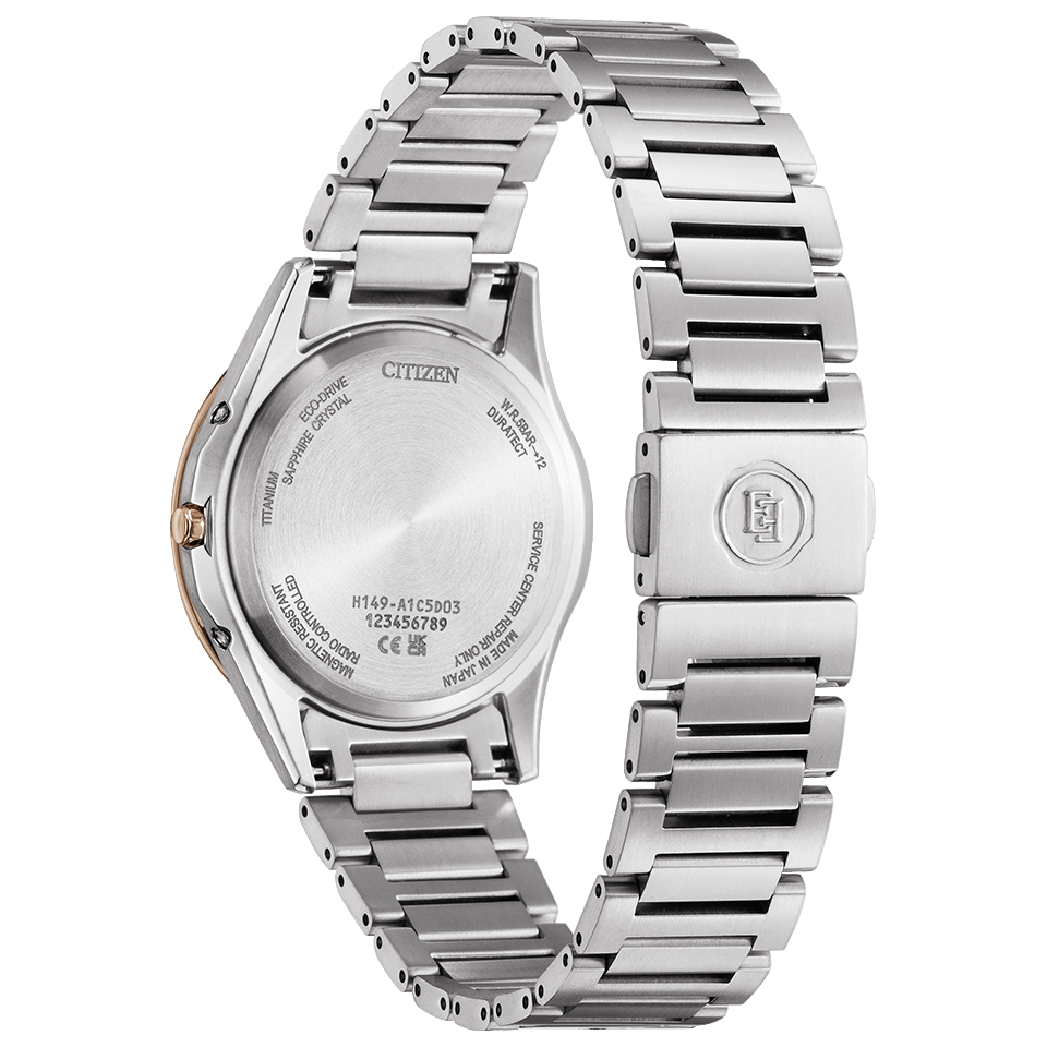 La ES9375-51B est la plus petite du trio avec 26,6 mm de large et seulement 7,7 mm d'épaisseur, pour un poids de 34 grammes. Elle fonctionne avec le calibre H060 et prend en charge la réception radio au Japon, en Chine, aux États-Unis et en Europe. La précision est évaluée à ±15 secondes par mois en l'absence de réception d'un signal. Le boîtier et le bracelet sont en super titane avec des traitements de surface Duratect Platinum et Duratect Sakura Pink, ce qui donne à la lunette une subtile teinte cerise qui s'harmonise très bien avec le boîtier argenté. Un cristal de saphir avec traitement de surface est posé sur le dessus, et la résistance à l'eau est évaluée à 5 bars. Le prix est fixé à ¥132,000 (~$846).