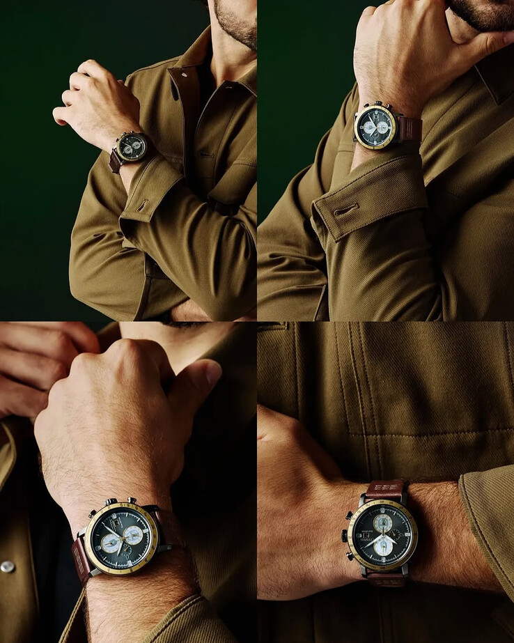 La montre est dotée d'un boîtier en acier inoxydable de 43,6 mm aux finitions sombres et d'un bracelet en cuir marron dont les coutures sont visibles près des cornes. L'aspect général est plus proche d'un chronographe de style pilote, mais avec de multiples références à la série intégrées dans le cadran. À première vue, le cadran semble être une surface gris soleil, mais un examen plus approfondi révèle des sous-cadrans thématiques. Le cadran supérieur utilise le symbole de la corne de boue, qui fait référence à la créature que Din Djarin vainc dans la série, tandis que le cadran inférieur affiche des illustrations de casques mandaloriens. De petites oreilles stylisées de Grogu sont également incorporées dans le design. Ces détails s'intègrent harmonieusement au chronographe plutôt que d'être trop voyants.