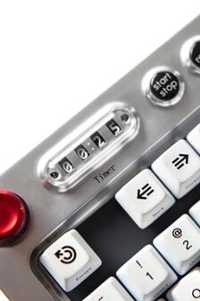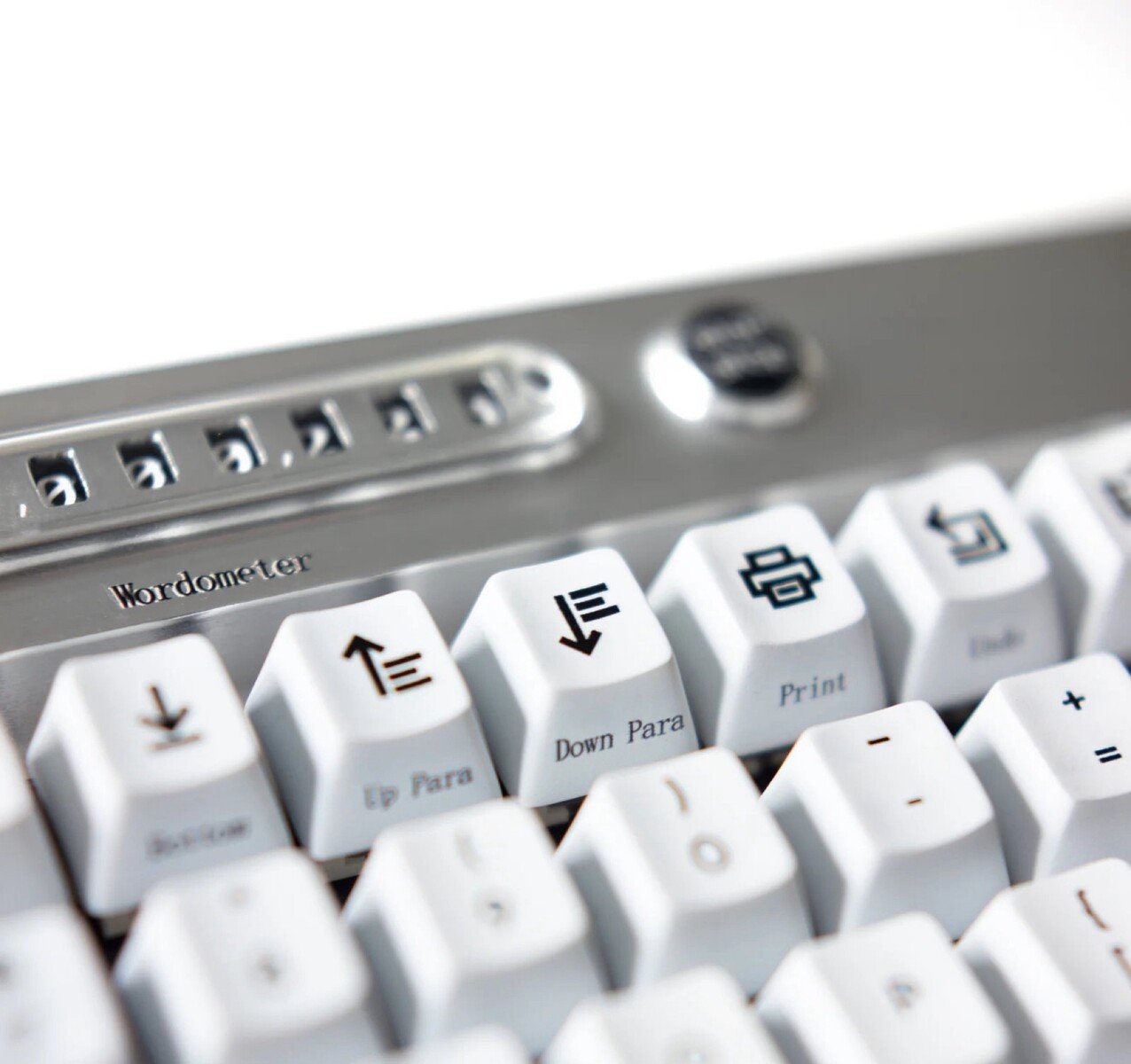 Le second écran est un compteur de mots qui indique le nombre de mots tapés depuis la dernière réinitialisation. Un bouton "start-stop" permet à l'utilisateur de mettre le compteur de mots en pause à tout moment afin qu'il ne comptabilise pas une recherche sur le web ou un message de chat, par exemple. Les deux écrans utilisent des roues tournées par un moteur pour afficher les chiffres correspondants de 0 à 9. Cela permet aux écrans d'afficher des informations, mais aussi de suivre la progression de l'écriture d'une manière tactile et audible.