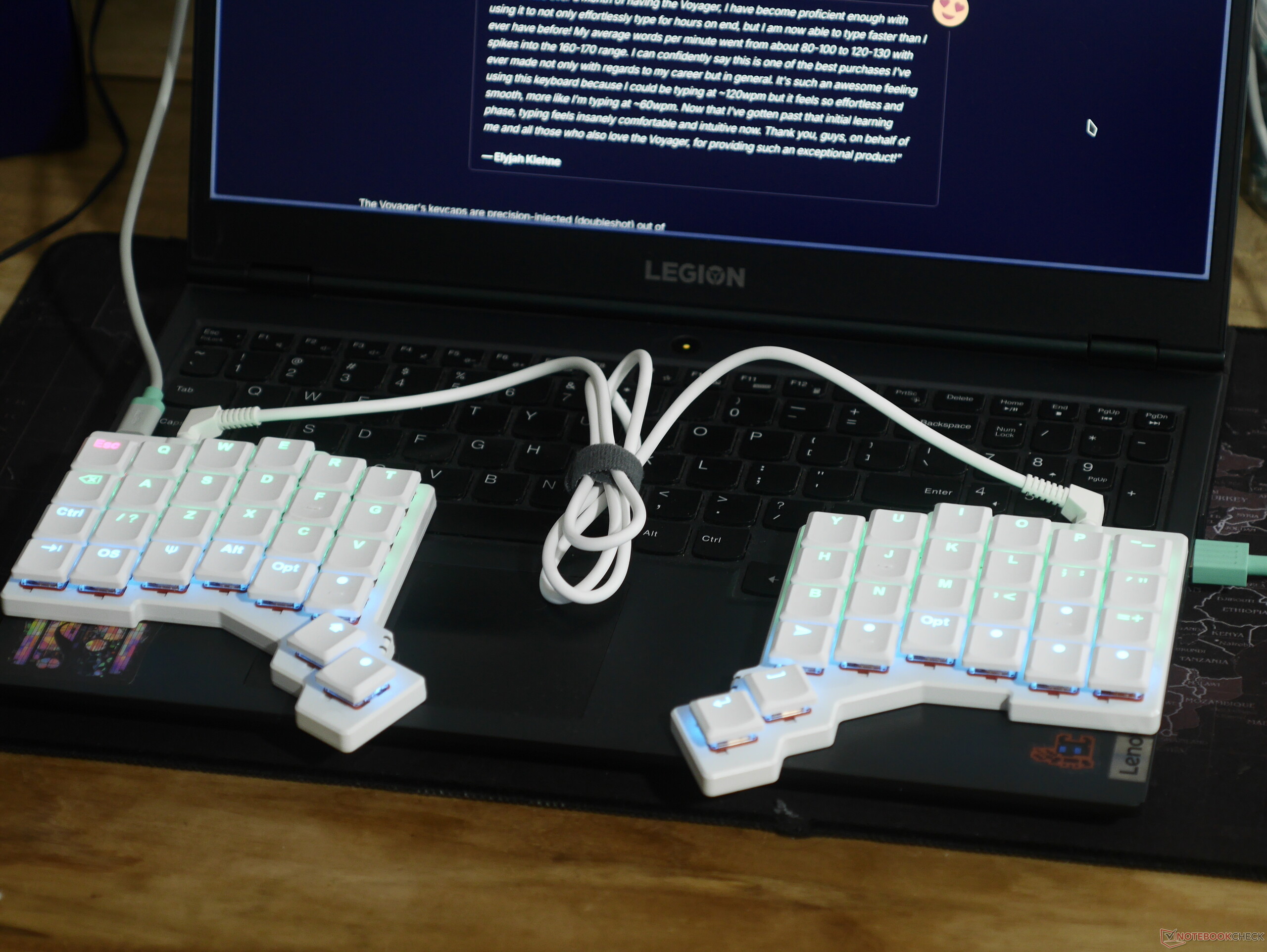 Comme il s'agit de mon premier clavier à deux touches et à colonnes, la période d'adaptation du Voyager a été assez courte, la précision et la mémoire musculaire revenant rapidement, mais atteindre ma vitesse de frappe habituelle d'environ 85 WPM a été un véritable défi. Cela dit, le fait de pouvoir placer les deux moitiés du clavier à la largeur des épaules rend les longues sessions de frappe très confortables, et il m'est devenu difficile de revenir à un clavier à dalles après le Voyager. Ayant utilisé des claviers à 40 %, comme le Epomaker TH40 que j'ai examiné précédemmentj'ai donc utilisé Oryx pour personnaliser ma disposition et éliminer la rangée de chiffres en faveur d'un ensemble de touches de modification sur la rangée inférieure.