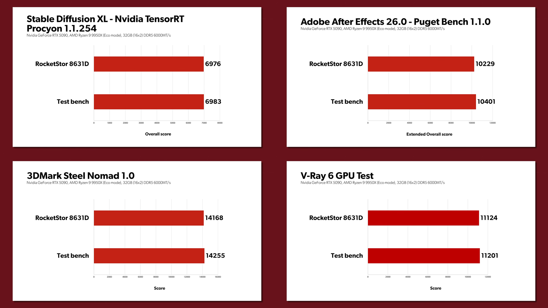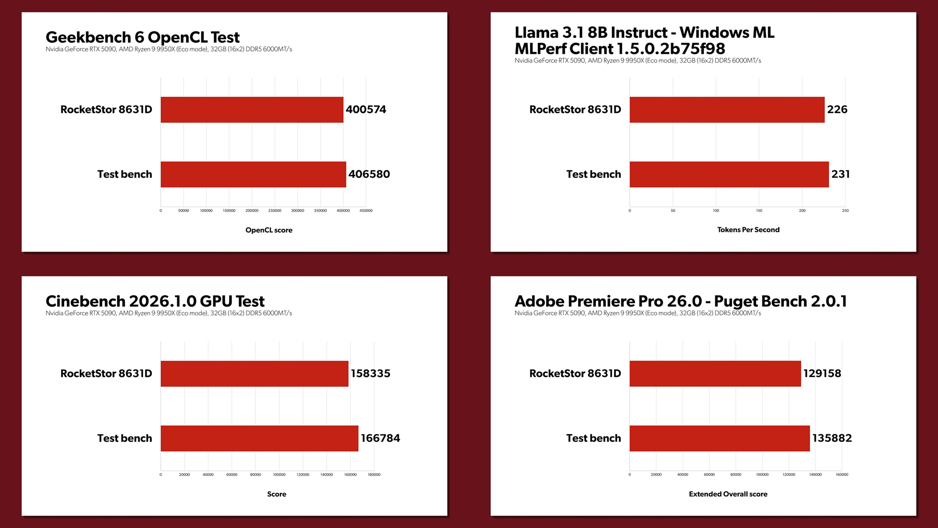 En ce qui concerne les benchmarks réalisés par PCWorld, ils indiquent une baisse moyenne des performances d'environ 2,29 % par rapport à la configuration native. En comparaison, un test réalisé par Golden Pig Upgrade en 2024 a mis en évidence qu'avec OCuLink, la baisse de performance peut atteindre 23 %.