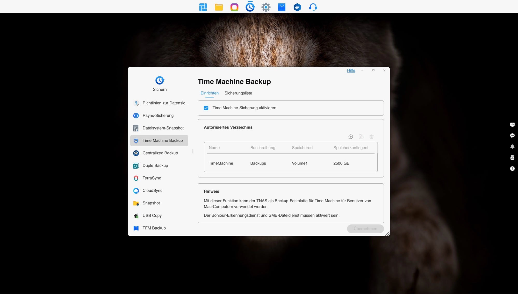 Outre un gestionnaire de fichiers et des outils de gestion de disque, TOS 6 comprend une application de sauvegarde qui peut créer des sauvegardes vers un stockage dans le nuage ou des clés USB, offrir un volume Time Machine pour macOS ou synchroniser des dossiers. TOS 7 devrait encore élargir l'ensemble des fonctionnalités avec des ajouts tels qu'un explorateur de fichiers multi-onglets et une gestion intégrée des machines virtuelles.