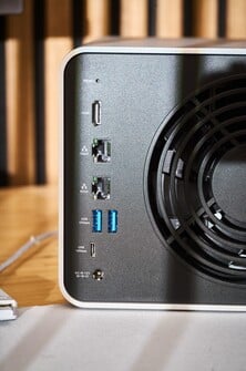 La sélection de ports USB est également impressionnante pour ce prix. TerraMaster inclut trois ports USB-A et un port USB-C, tous évalués à 10 Gbps. Cela facilite l'intégration de disques externes dans le réseau via le F4-425 Plus, par exemple pour utiliser un disque dur USB pour les sauvegardes Time Machine automatisées.