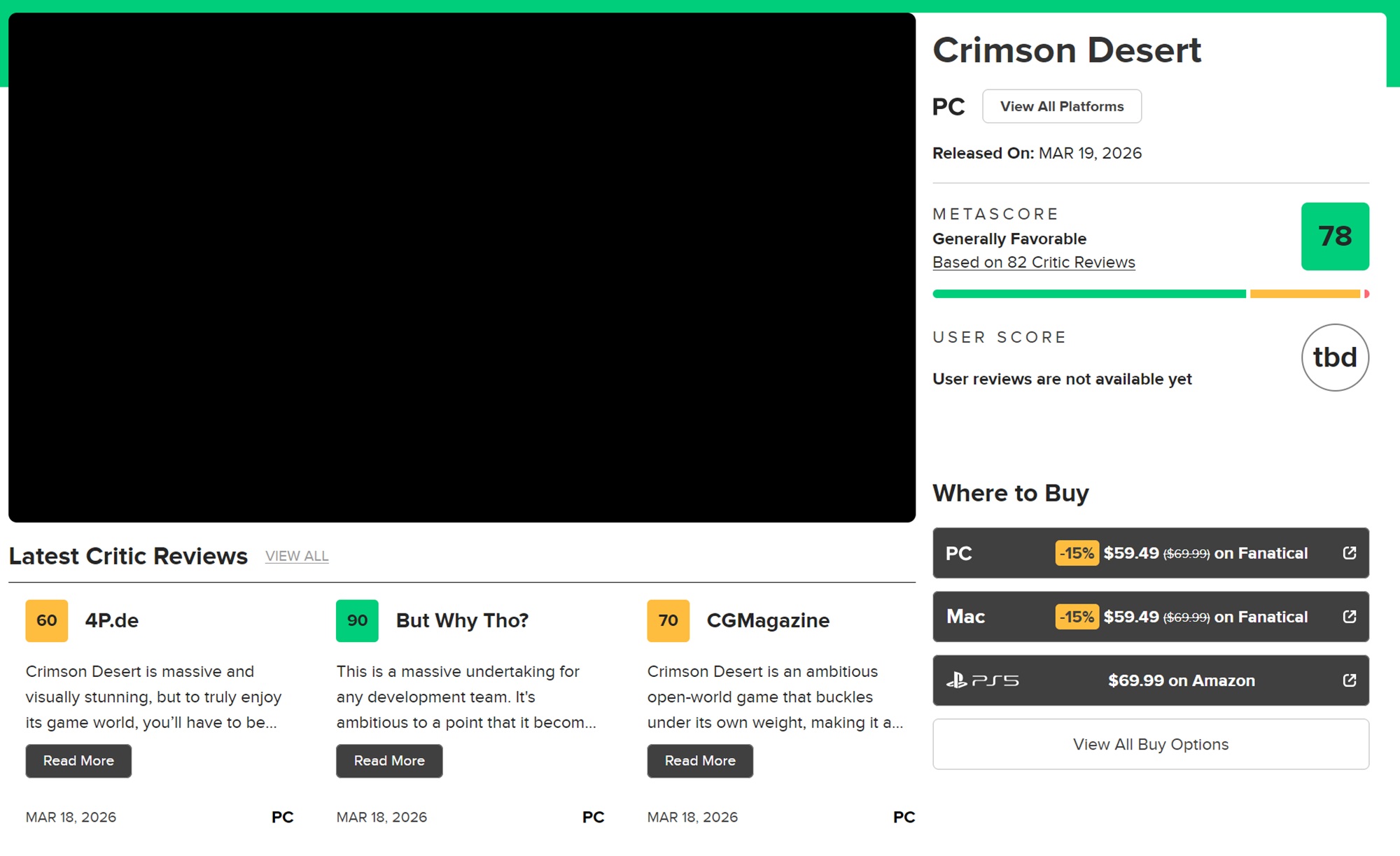 Si elles ne déterminent pas toujours les ventes, les critiques peuvent néanmoins influencer les décisions d'achat. L'embargo sur les critiques de L'embargo sur les critiques de Crimson Desert a finalement expiré, libérant des dizaines d'évaluations sur Metacritic. Après 82 évaluations, le jeu en monde ouvert a un Metascore de 78. La plupart des sites font l'éloge de ses graphismes et de sa physique ambitieux, mais notent des désagréments qui pourraient frustrer de nombreux joueurs.