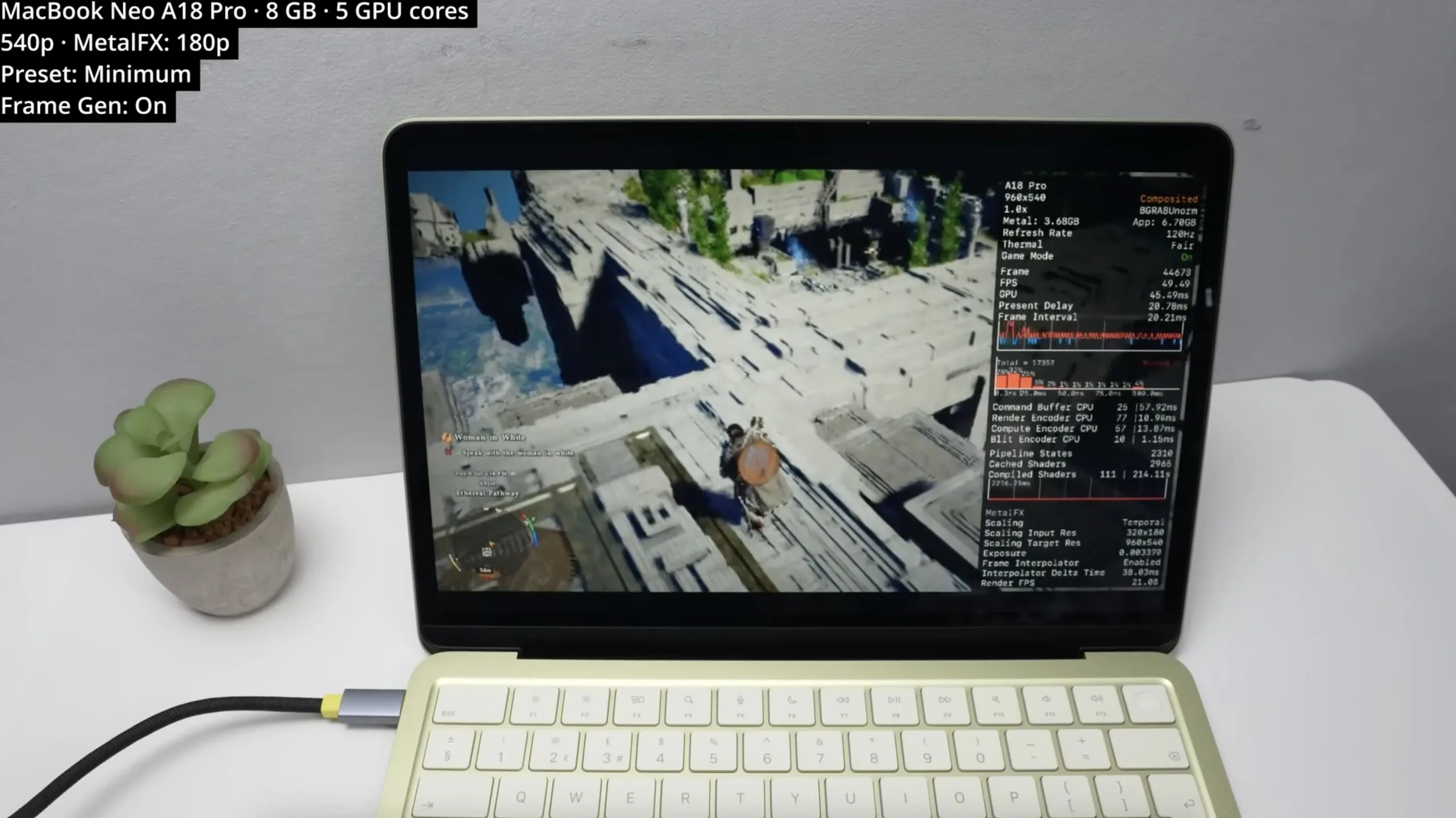Avec le préréglage minimum, l'upscaling MetalFX d'un ridicule 180p à 540p, et la génération d'images activée, le MacBook Neo parvient à faire tourner Crimson Desert à environ 50 FPS. Si l'on considère que l'A18 Pro avec un gPU à 5 cœurs à 5 cœurs dispose de mesh shaders accélérés au niveau matériel, les performances semblent être presque aussi bonnes que celles du M1.