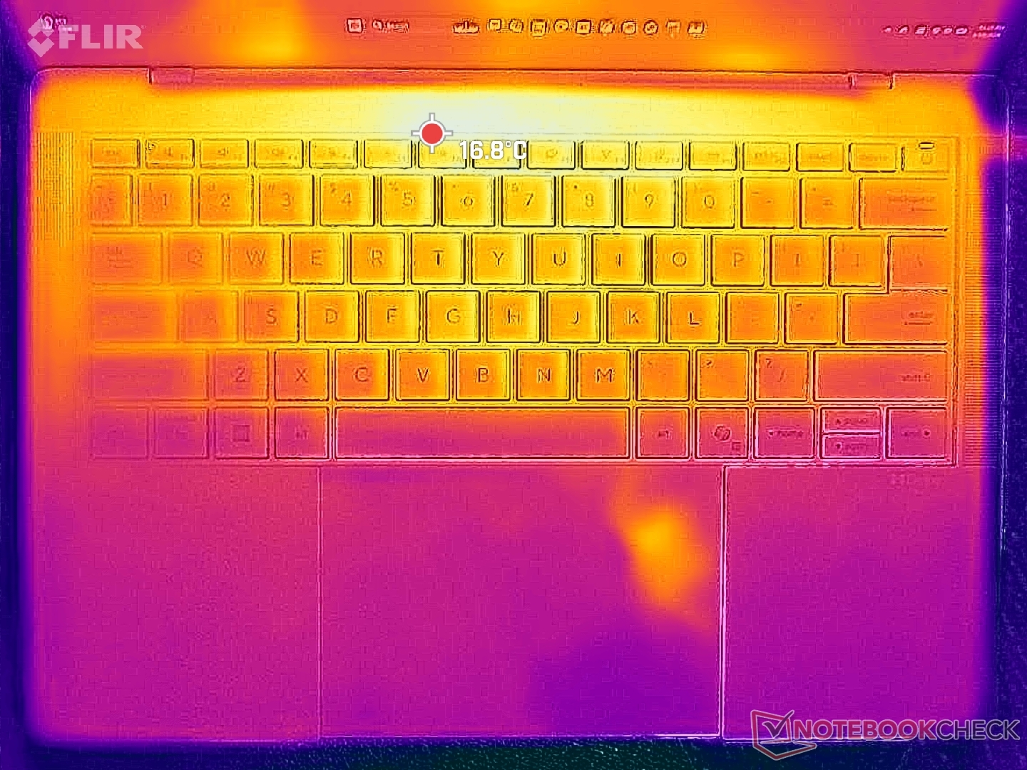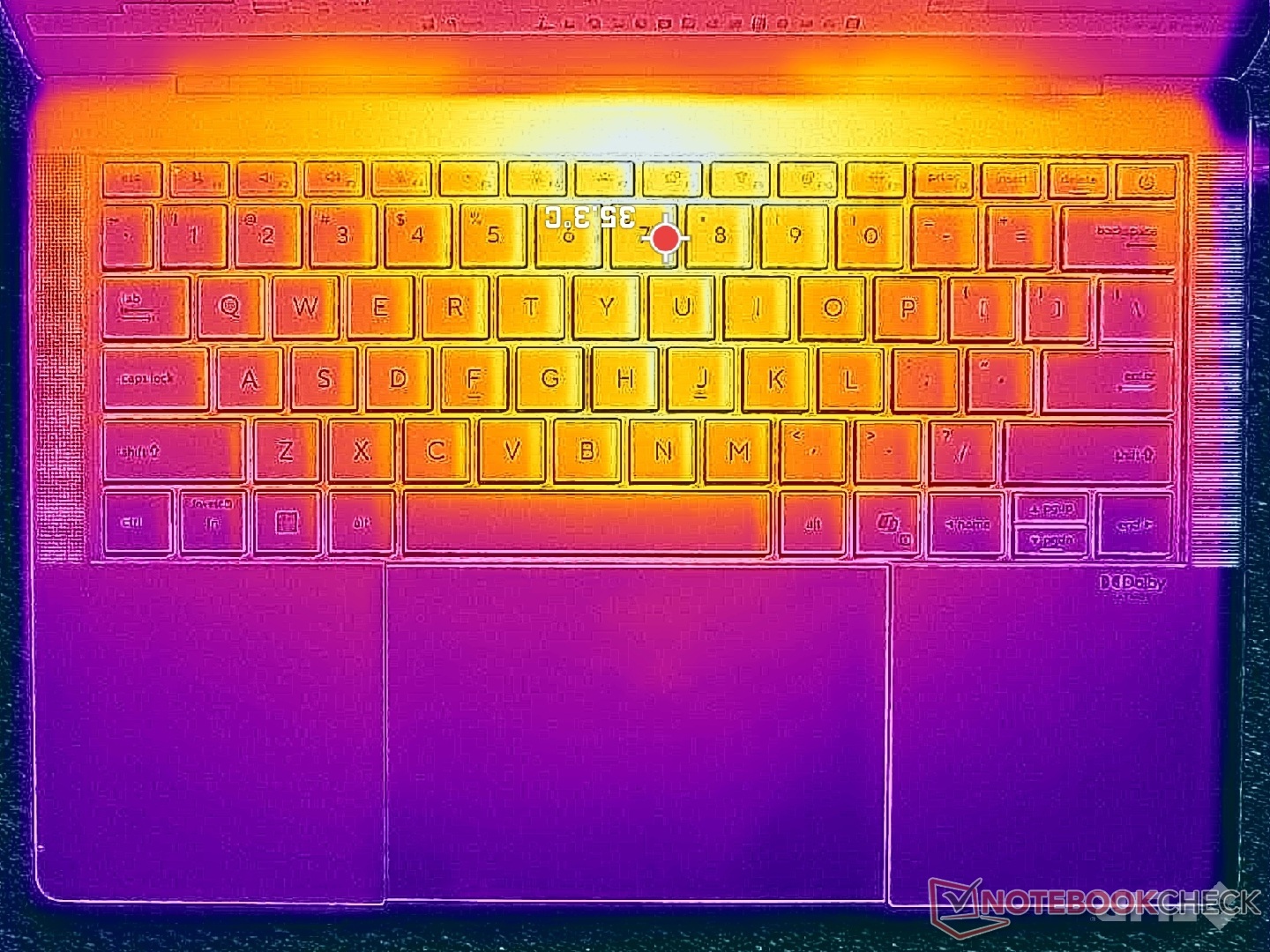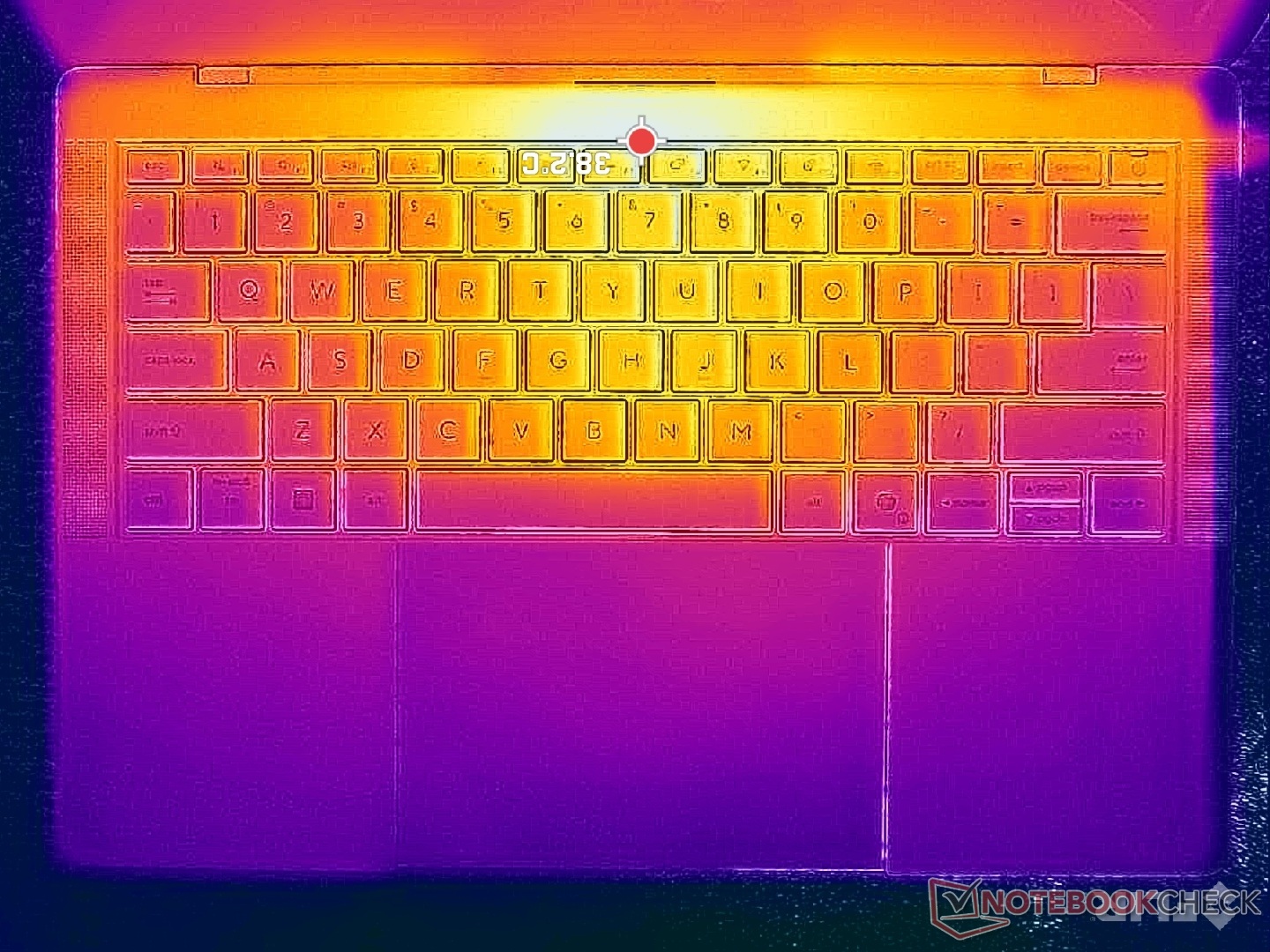 Le gradient de température de surface est plus ou moins symétrique en raison de la solution de refroidissement sous-jacente. Les points chauds au centre du clavier et sur le panneau inférieur peuvent atteindre jusqu'à 41°C chacun lors de l'exécution de charges exigeantes pendant des périodes prolongées, ce qui est légèrement plus froid que sur le HP EliteBook Ultra G1i 14 HP EliteBook Ultra G1i 14 équipé d'un processeur Lunar Lake-V plus lent.