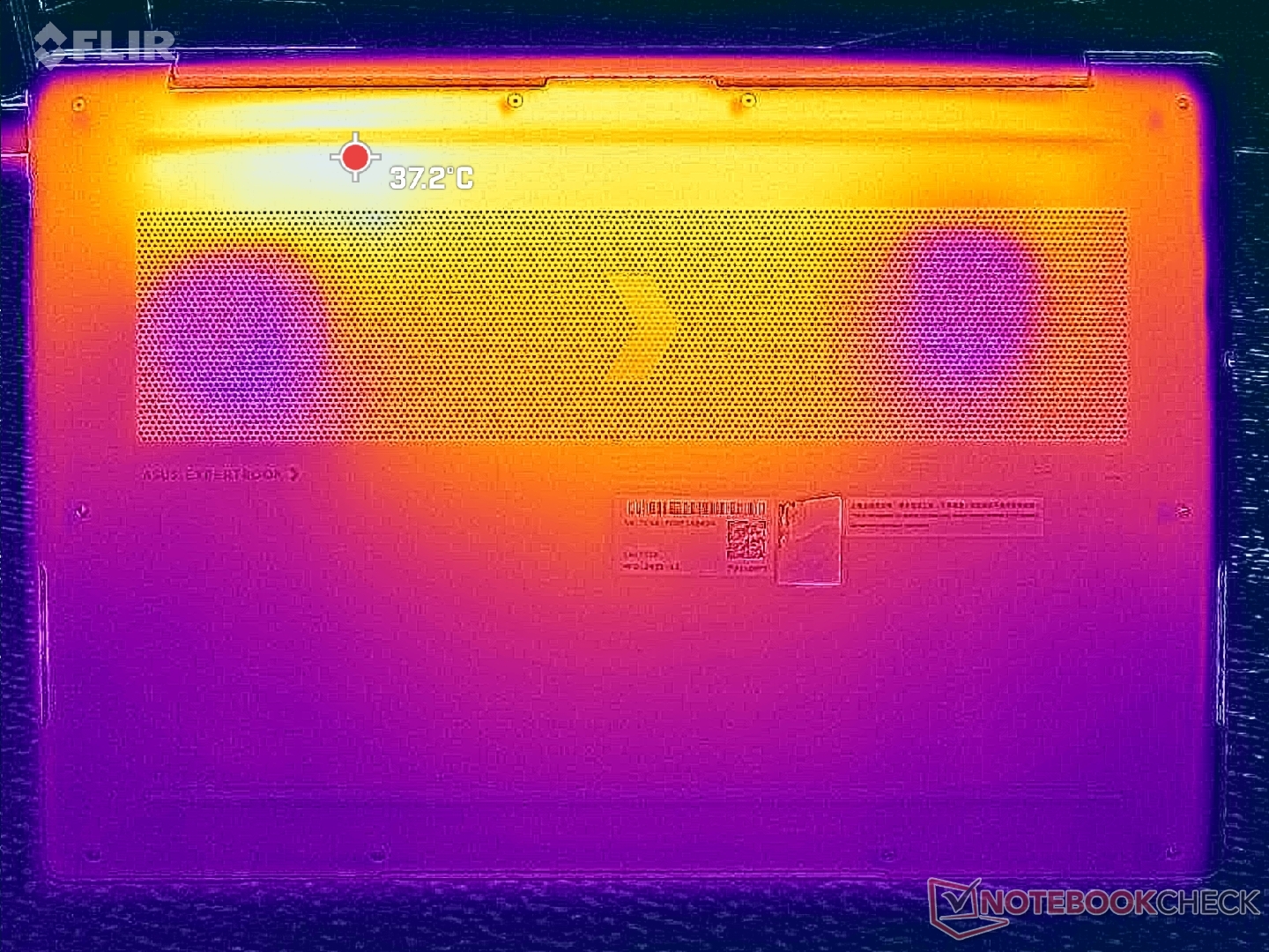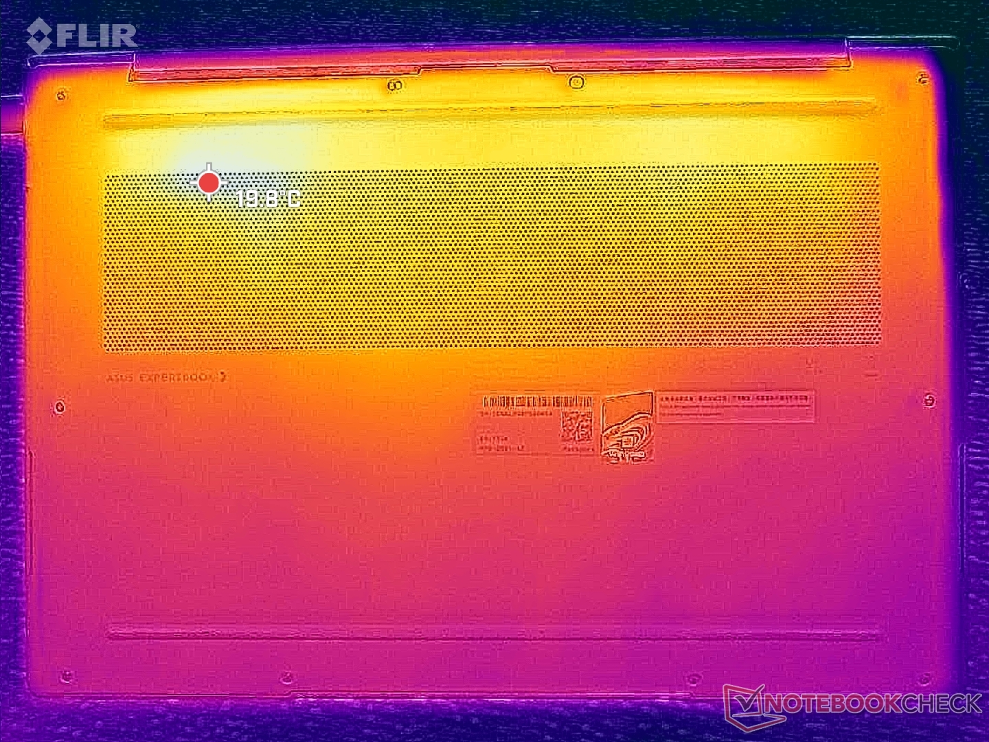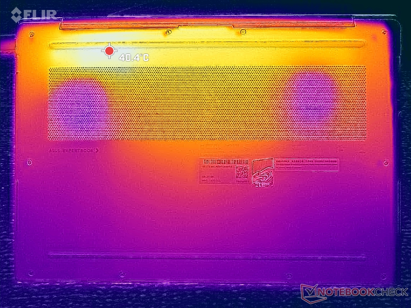 Le gradient de température de surface est plus ou moins symétrique en raison de la solution de refroidissement sous-jacente. Les points chauds au centre du clavier et sur le panneau inférieur peuvent atteindre jusqu'à 41°C chacun lors de l'exécution de charges exigeantes pendant des périodes prolongées, ce qui est légèrement plus froid que sur le HP EliteBook Ultra G1i 14 HP EliteBook Ultra G1i 14 équipé d'un processeur Lunar Lake-V plus lent.