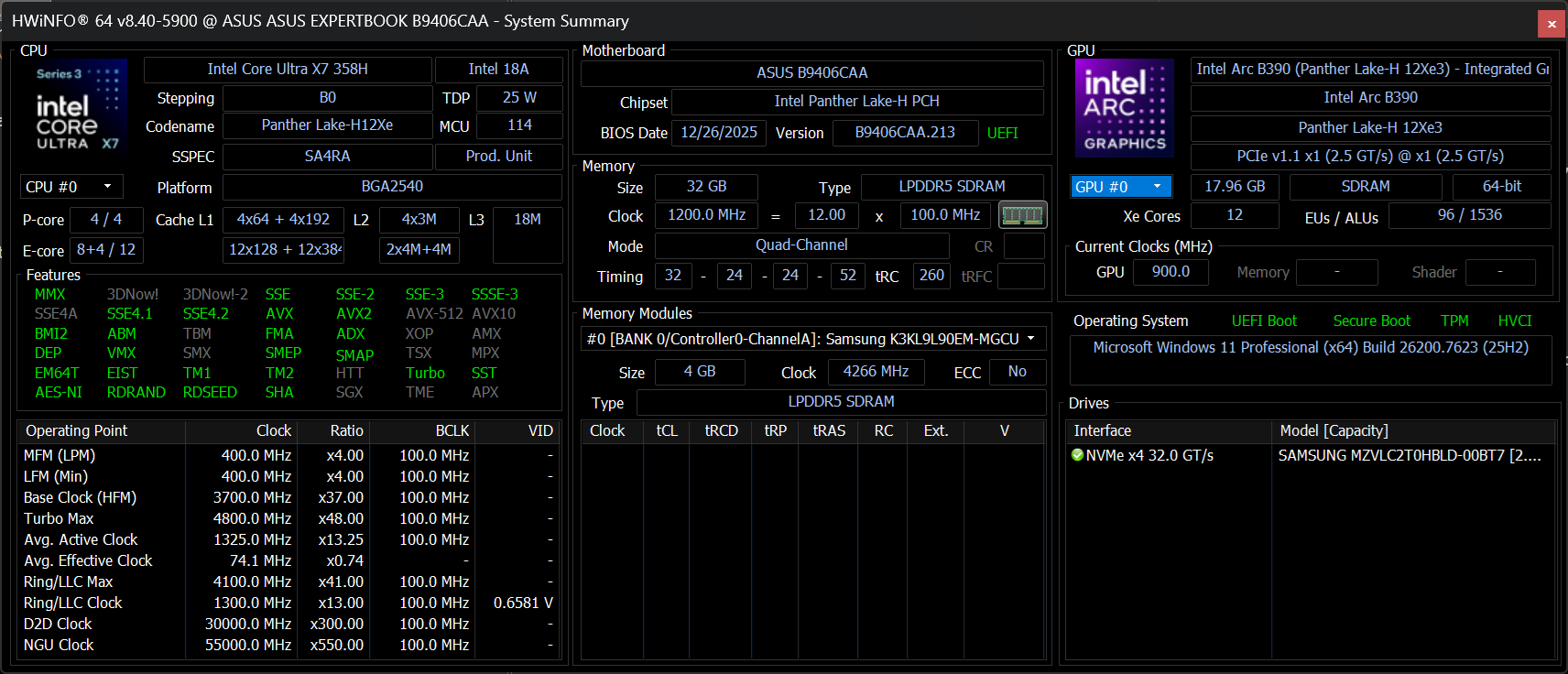 | Asus ExpertBook Ultra B9406CAA Ultra X7 358H, Arc B390 Panther Lake iGPU | Dell Pro 14 Plus PB14255 GH77W Ryzen AI 7 PRO 350, Radeon 860M | Asus ExpertBook PM3406 Ryzen AI 7 350, Radeon 860M | Lenovo ThinkPad T14s Gen 6 Intel Core Ultra 5 228V, Arc 130V | Samsung Galaxy Book5 Pro 14 940XHA Core Ultra 5 226V, Arc 130V | HP EliteBook Ultra G1i 14 Core Ultra 7 258V, Arc 140V | |