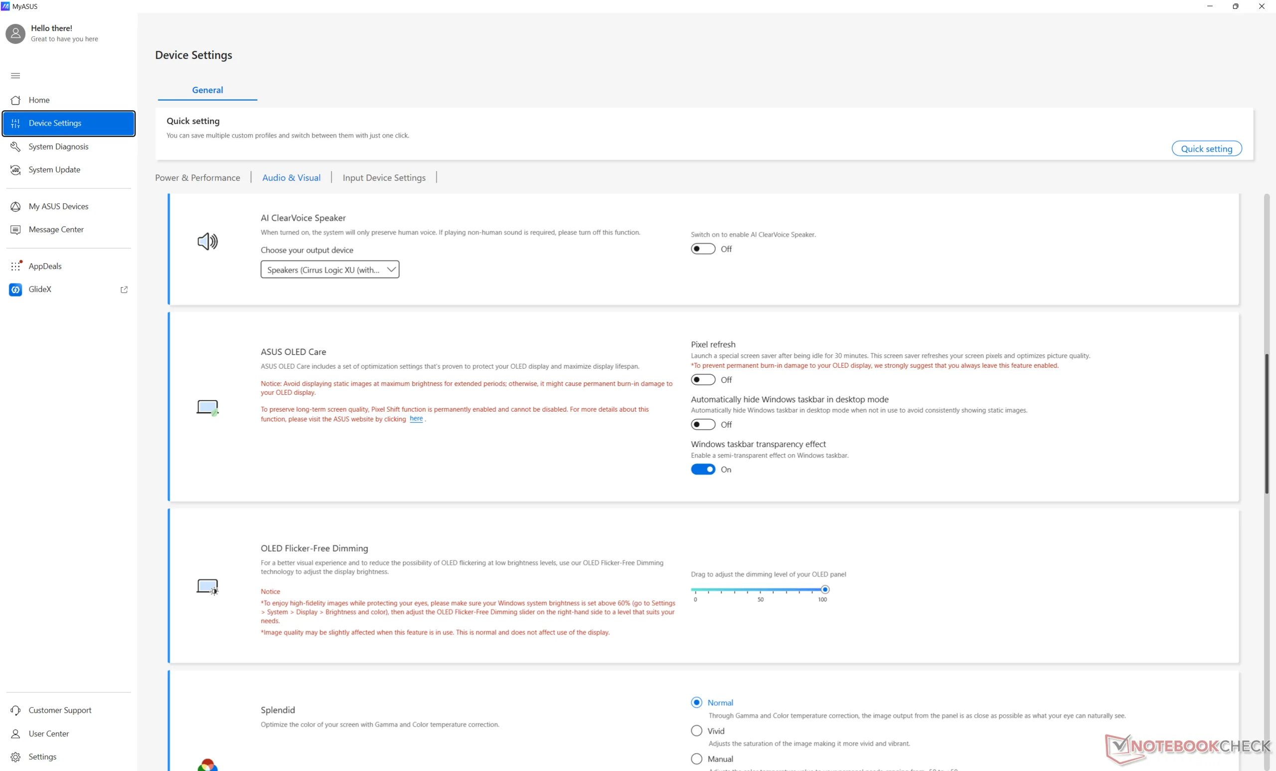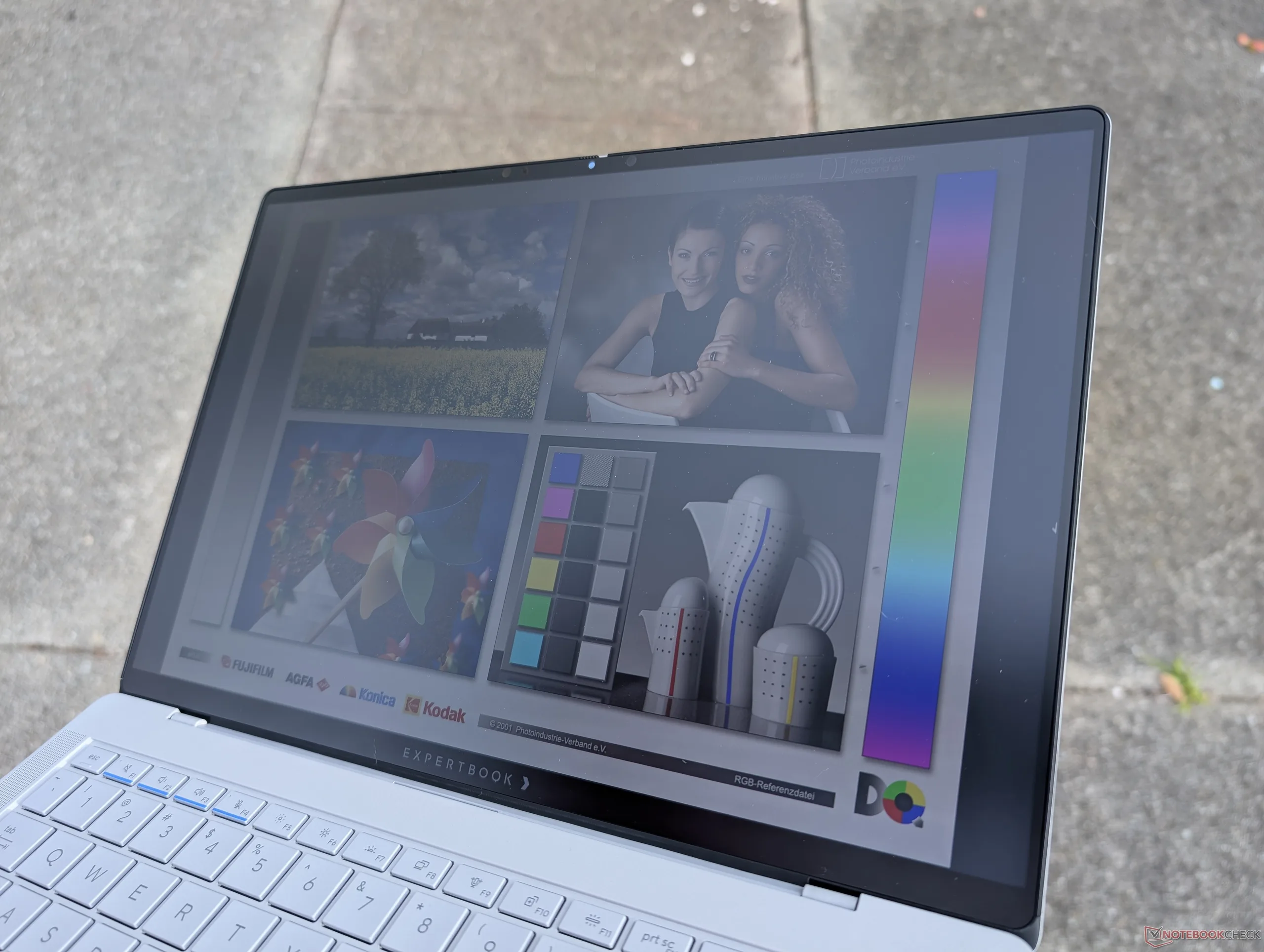 L'un des principaux avantages de l'OLED en tandem est sa luminosité beaucoup plus élevée que celle de l'OLED standard. En effet, nous avons pu mesurer une luminosité maximale de 1403 nits en mode HDR, alors que les écrans OLED de la plupart des autres ordinateurs portables ne dépassent pas la moitié ou moins. Les niveaux de luminosité plus élevés, accompagnés des niveaux de noir profonds pour lesquels l'OLED est connu, conduisent à un contenu HDR encore plus vibrant sur l'ExpertBook Ultra. La luminosité maximale est limitée à 600 nits en mode SDR par défaut.