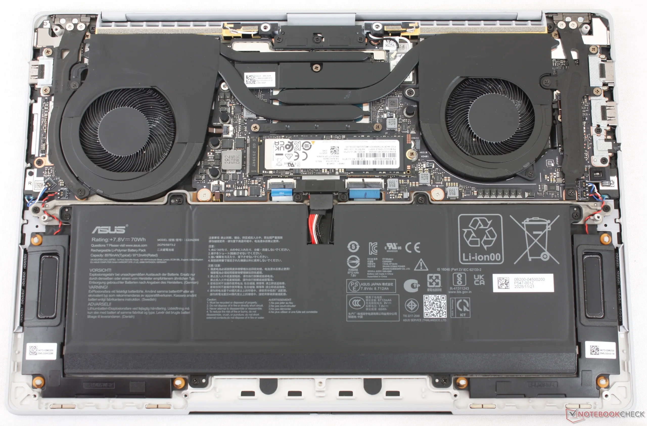Alors que la capacité de 70 Wh est ordinaire pour la catégorie des 14 pouces, la durée de vie de la batterie est tout autre. L'Asus peut tenir un peu plus de 16 heures en navigation WLAN avant de s'éteindre automatiquement, soit plusieurs heures de plus que beaucoup d'autres subnotebooks, y compris l'ExpertBook PM3406 équipé d'AMD ExpertBook PM3406.